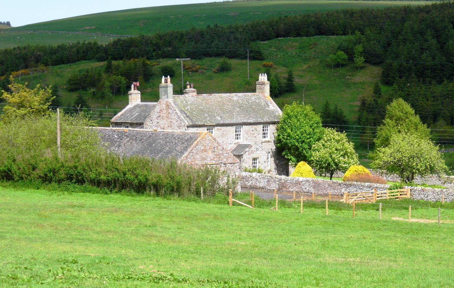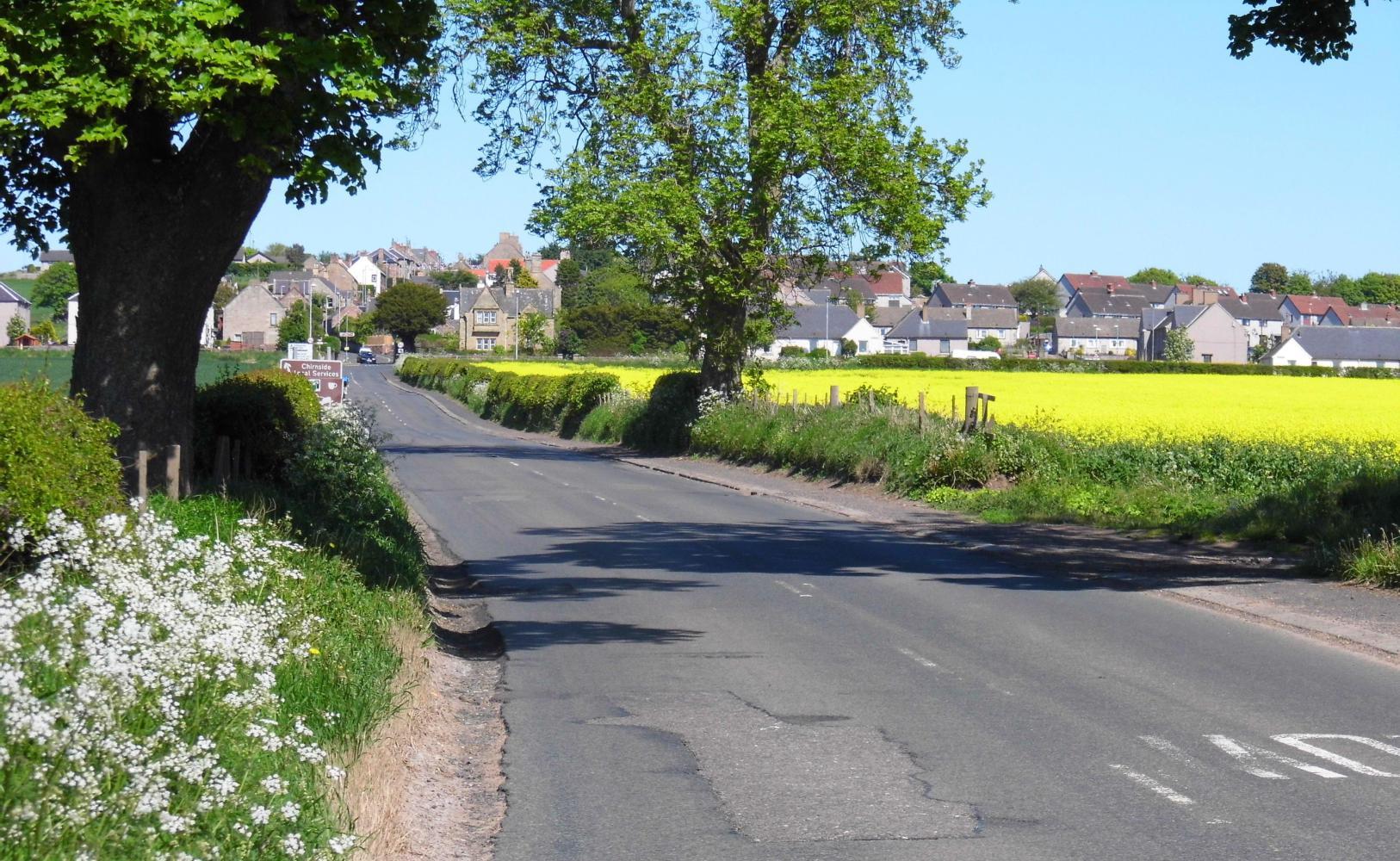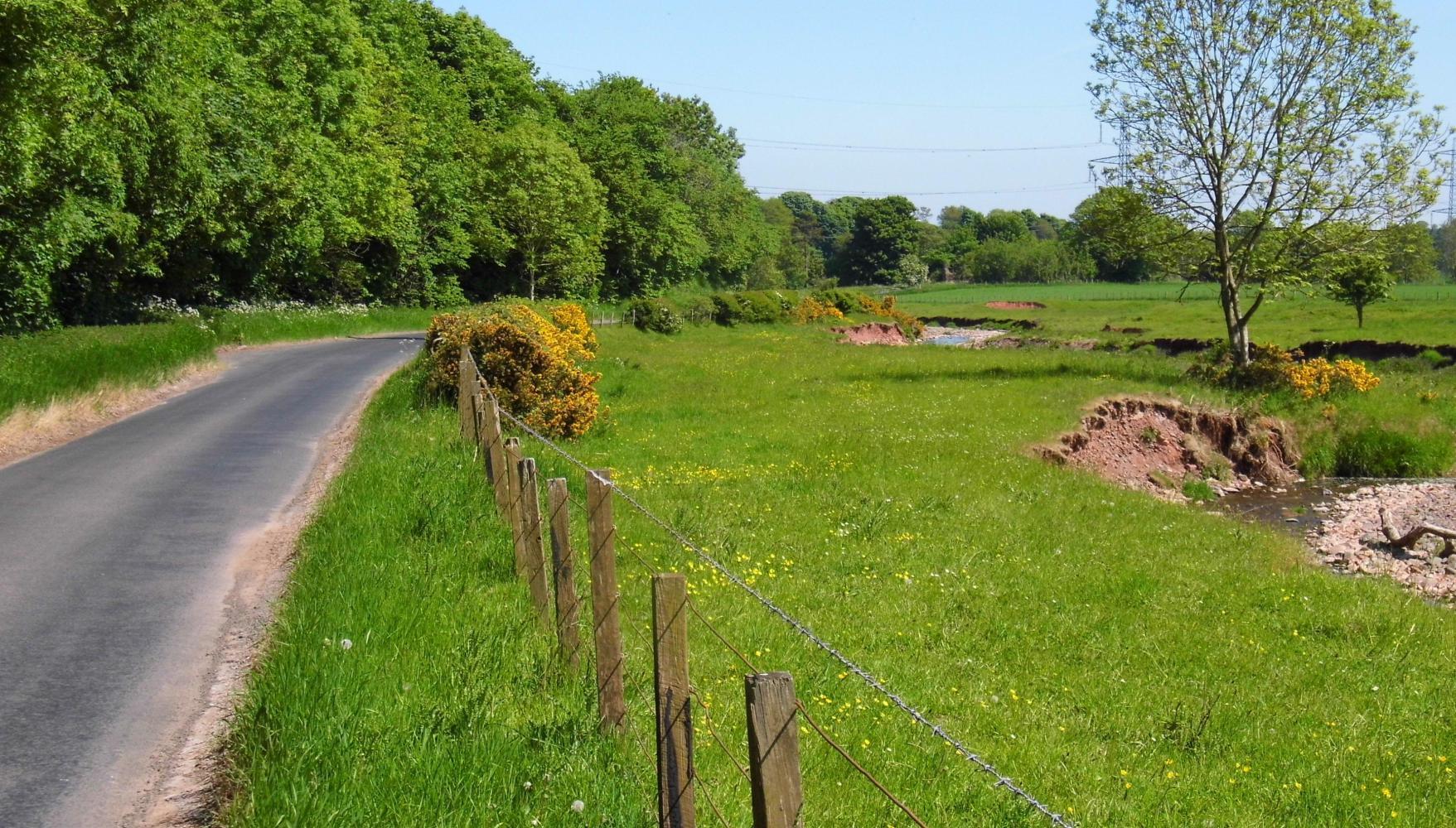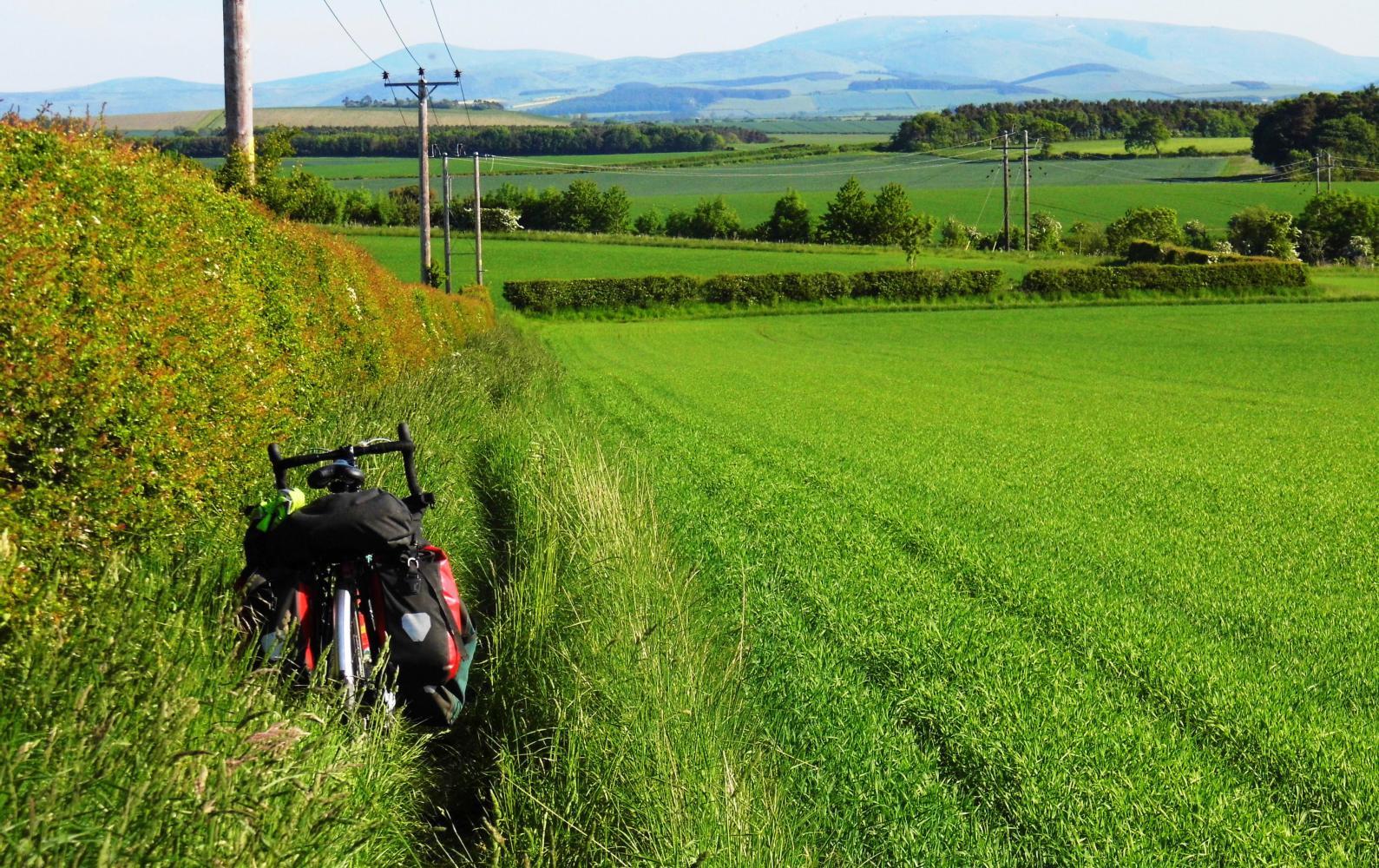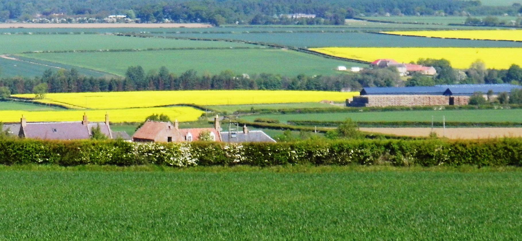 The road continued down through tranquil valley. At a T-junction I turned for Cairside and the road dropped down further. I was back to huge fields, blocks of the yellow stuff striped between deep green, plus ridged brown fields of potatoes, there leaves just emerging from the ground. There was a long way between farms, a mile or more at lease, meaning each farm in this corner of Scotland most cover an area of a few thousand of acres.