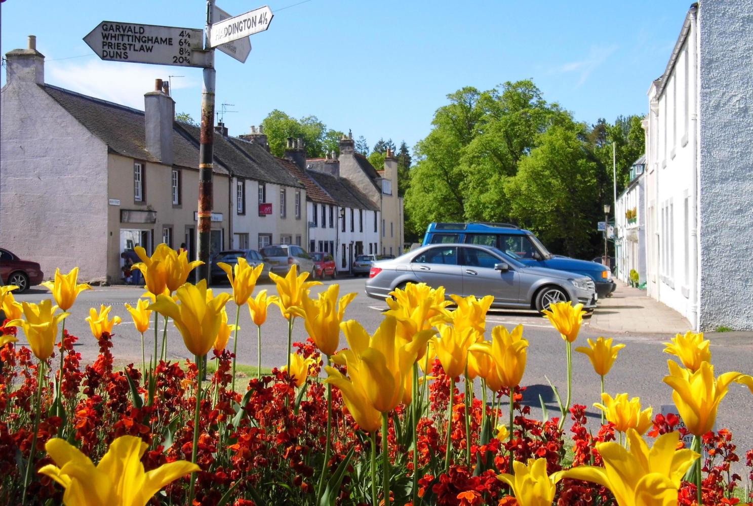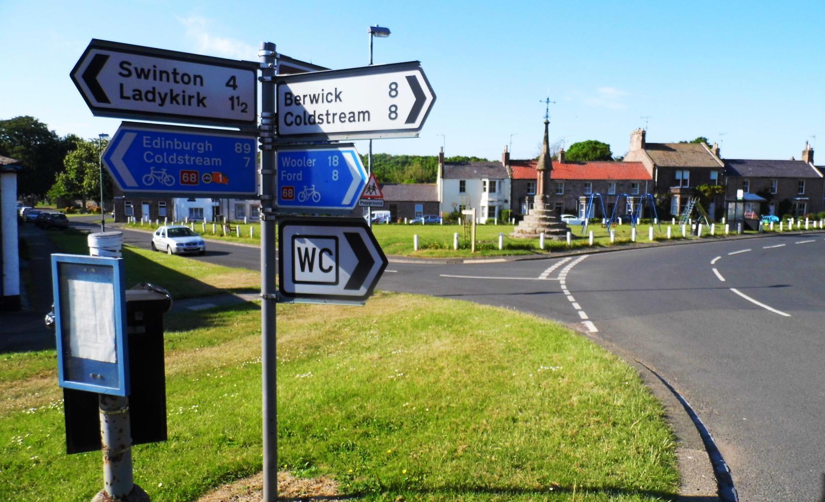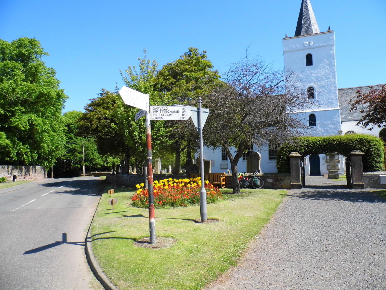 It was a good place to relax. The bench had "In Memory of Malinda, 1960 to 2005". And there was a circle of red and yellow flowers on the green, on the corner of which was an old signpost with, Edinburgh 20 miles. I reckoned it wasn't much to show for the morning, but having eaten lunch early, I'd ride all afternoon with only minimal stops, doing the bulk of the day's mileage.