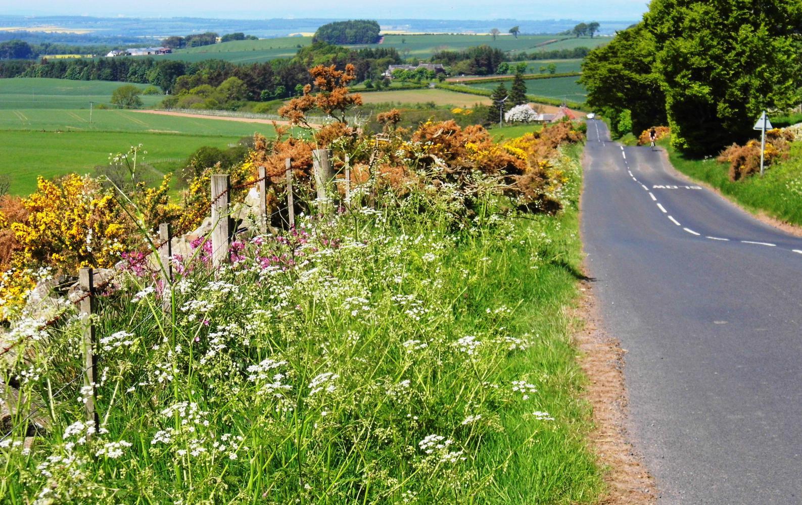 From Transent Is on the B6355 where in a short distance I rode pass the last semi-detached house and was out on a quiet country road between verges of wild flowers, with a long hillside striped deep green and bright yellow, the former wheat and the later oil-seed-rape, which is grown to produce vegetable oil. Like the colour of a hi-vis vest, there were blocks of the yellow stuff everywhere; and together with wheat and barley which is a lighter green, it was all arable with not a field of sheep in sight.
