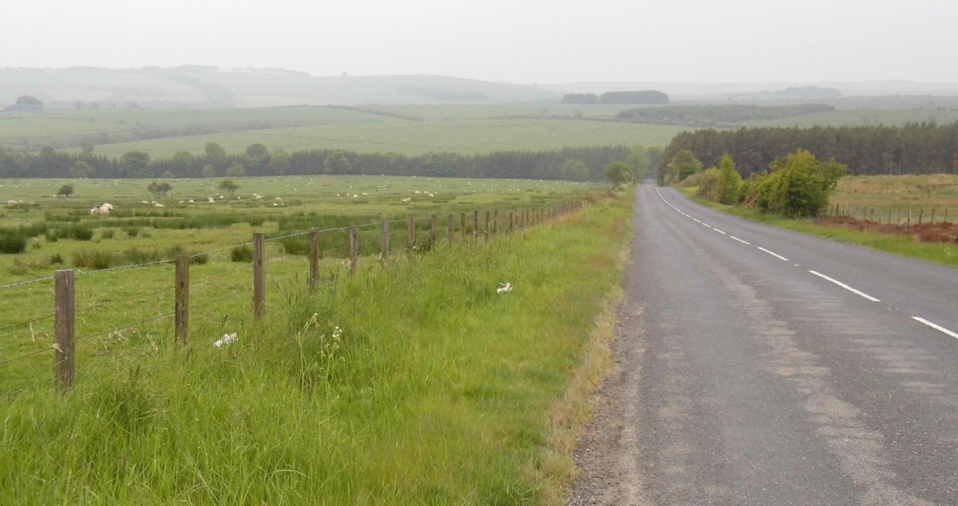 Where the street dipped down to it's lowest point, there was a corner on the right with a narrow street, which if any road led out of town south this would be it. It curved round and across a humpback bridge, the other side of which I saw what Is looking for; the sign B6342, Cambo 13 miles, the next town south on the map. There followed a steep hard grind up from the riverbank. Once I'd passed the last house the road levelled out, but ahead came a longer climb up over the slope along the south of the valley, in which I could see the road on the hill veer right, then left and right again, reducing the gradient.