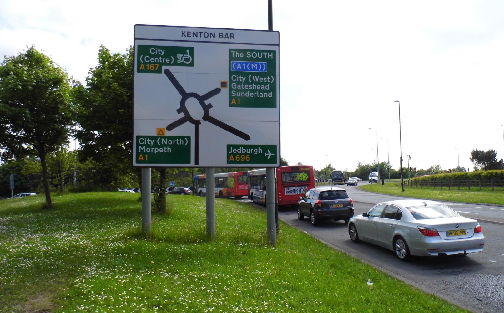 I was near Newcastle now, but from Ponteland, about six mile from the centre, there seemed no alternative to the A696 to begin with; then, I spotted a service road alongside. This took me most of the way, until a roundabout where there was no other way that I could see; and so rode on the hard-shoulder of another A road, just to the next exit, where it was signed: Centre North.