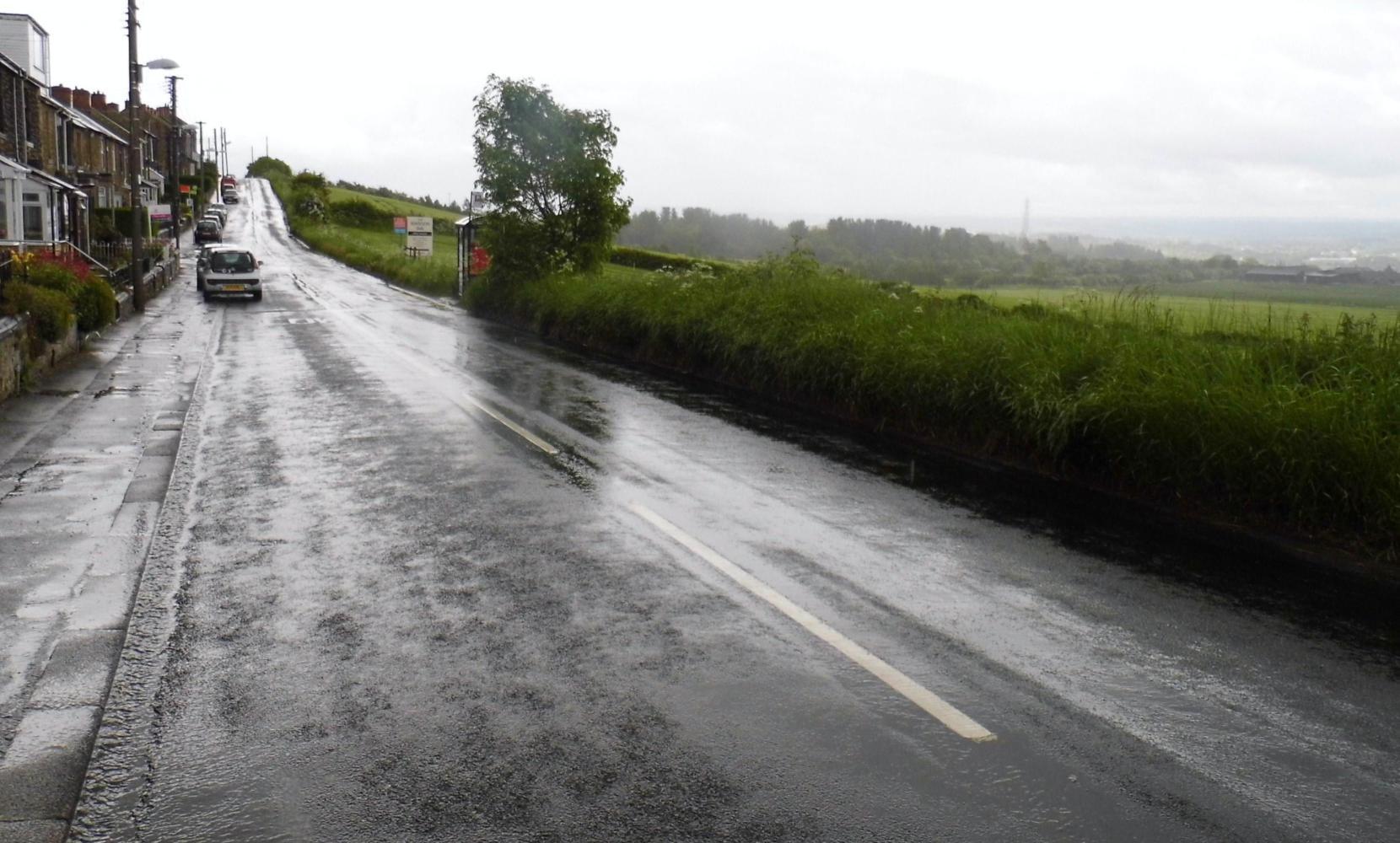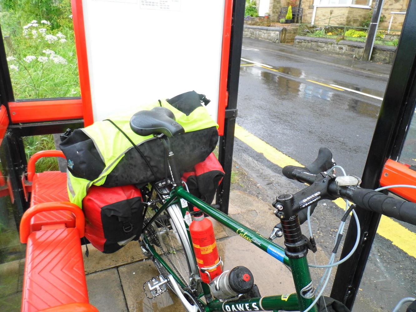 The morning was dull and the streets were wet as I climbed the hill out of Gateshead; and as the road crested the hill, Is on a road with houses along the left side and a view off over open countryside to the mountains on the right, were the rain was coming down and closing in. Soon it came down in big cold spots pelting off the road. I had no place to run in to shelter so I could put on my waterproof, until I got to a bus-shelter.