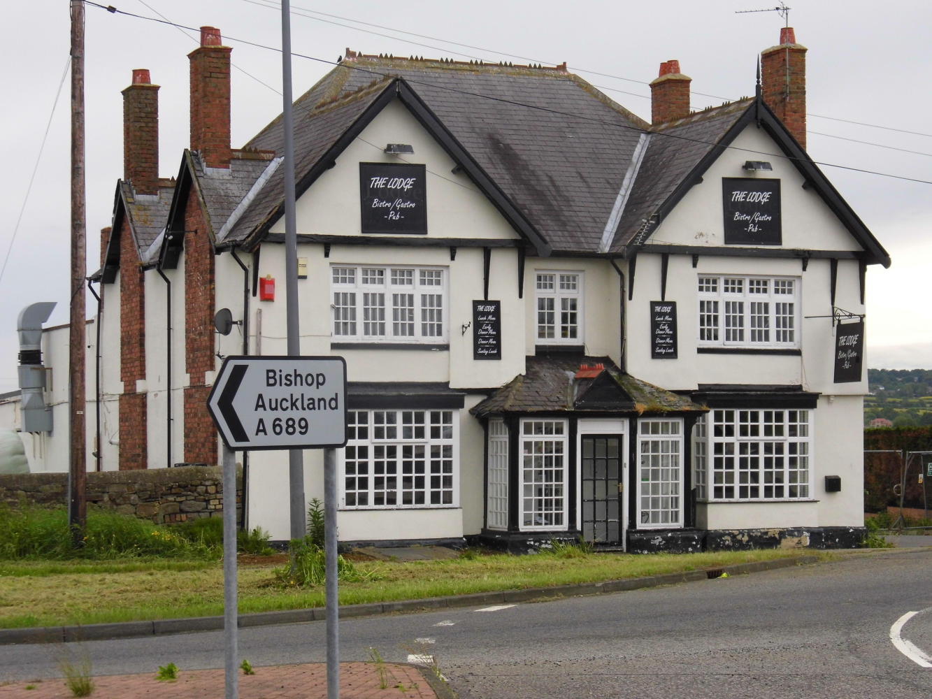 I passed through a few roundabouts until reaching the one with an exit for Durham. I turned off and shortly came to a small roundabout where I wasn't sure which way I should turn for the town centre. But at a pedestrian traffic light on the road I turned onto that looked most likely, I saw two elderly cyclists and the blue cycle-route signs again; one, pointed to Bishop Auckland, exactly the way I needed to go, the other, Durham centre, where I needed to buy supplies.