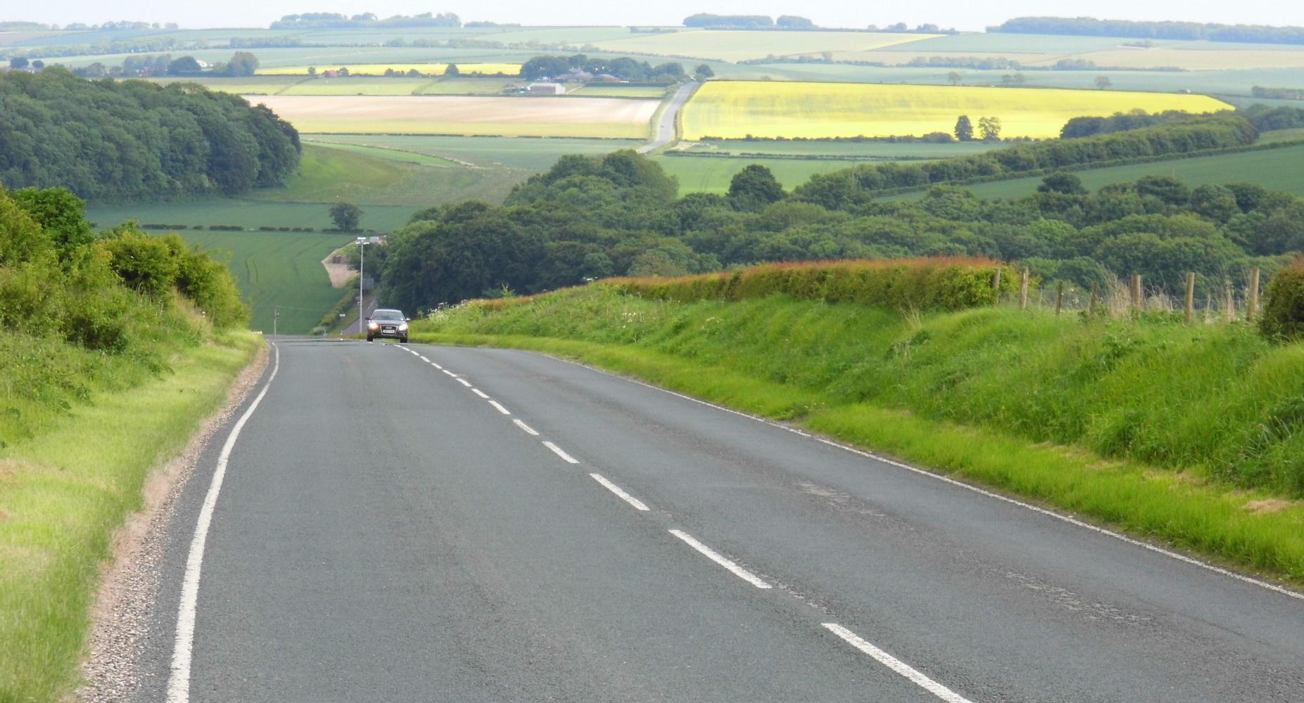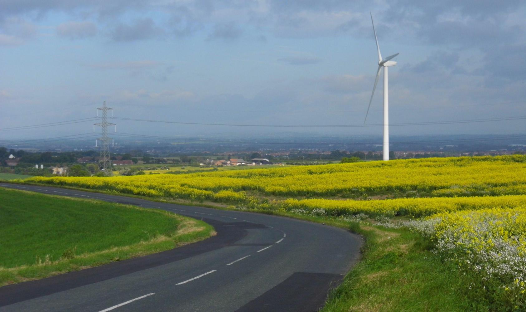 The blue cycle-route signs guided me onwards round a busy A road with turnings for: Teeside, Thirsk and Northalleton; and took me upover a gentle slope past pylons and giant wind-turbines in fields of the yellow rape-seed, then down to Stokeley.