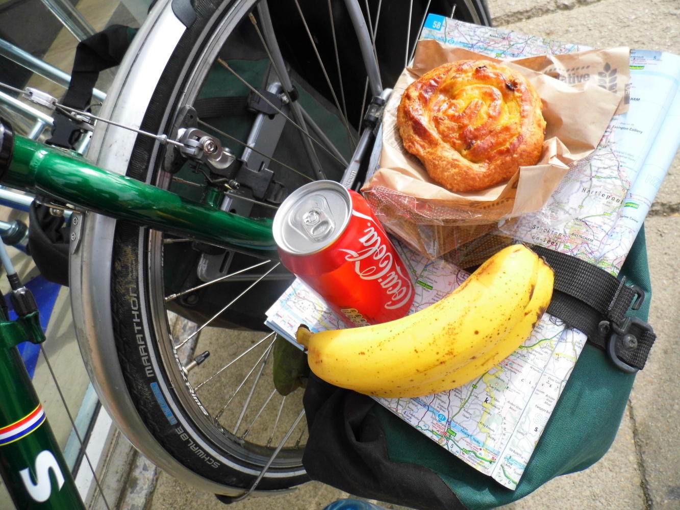 Outside by the shopping-trolleys I was using the atlas which I'd strapped on top of the front-pannier as a table and had set out my breakfast for a photo. "Ye cy-kelled far" came from a man on a shopping-bike. Hard to say how old he was but I'd say he was a youthful seventy. He took a keen interest in the Galaxy. I told him this particular model suits me, all the others have STI integrated gear and brake levers; and I don't want them wearing out somewhere and having to ride in one gear to the next town. "A know.I hav them on m-eye road-by-ike and they are so finicky" He went on then to tell me about his forthcoming cycle-tour in Croatia.......