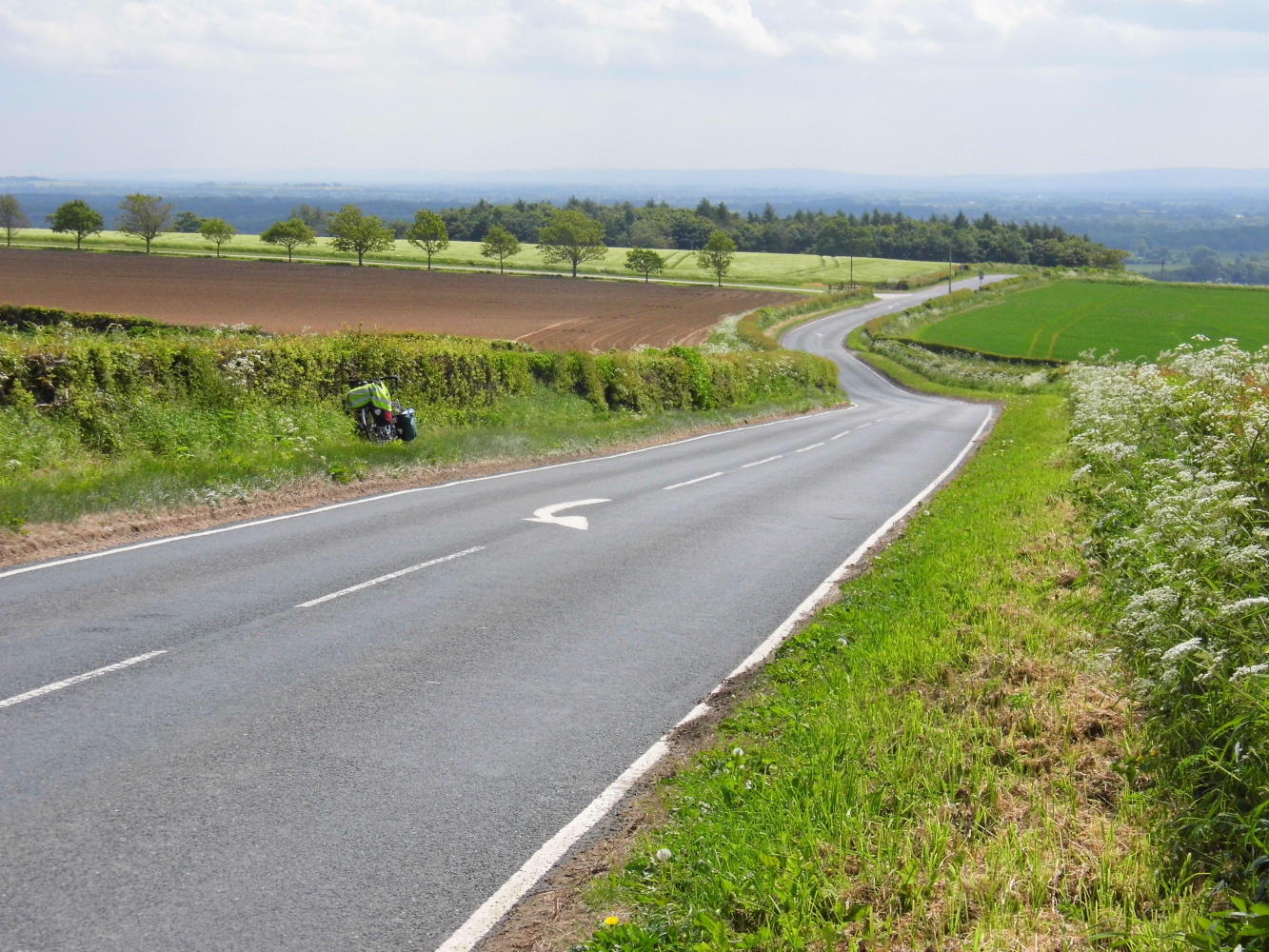 It was a busy street of cars and commercial vehicles queued at traffic lights on the way through Malton. Then I was back on the B1257 in the Yorkshire Wolds. I think Wolds mean low hills and there certain was plenty of short steep climbs and longer uphill drags; plus there was a lot of traffic. They all came at once, especially when I stopped to take a photo. I wanted off the road for the day and I didn't have to wait long. There was a narrow grove of woodland which ran off at a right-angle to the road and formed the boundary between two fields, and had a track along one side which I turned off the road and rode along; and as luck would have it, just around a bend in the grove which took me out of sight of the road, there was a square of short grass enclose by a hawthorn hedge on two sides. It was only half four but when I'd the tent up and a while later when I'd eaten and was inside uploading photos to the computer, the rain came on, drumming on the tent.
