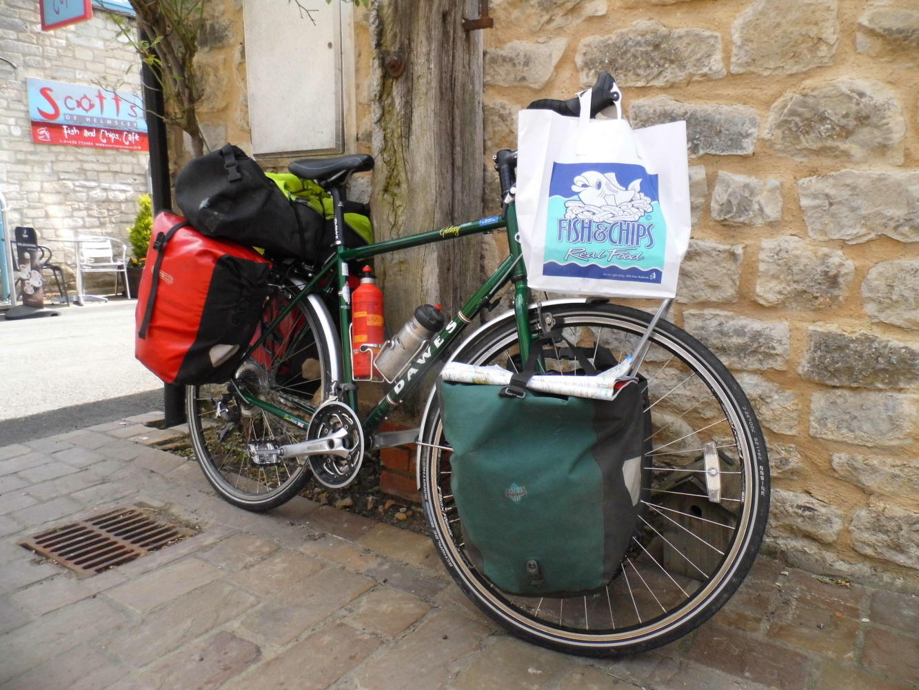 The main thoroughfare wound it's way through towm between shops and sturdy Yorkshire stone houses, past a green, until I pulled up in front of a Co-opertive grocery-shop. It was quite a bit to the next town so I wanted more to eat and I didn't lock the bike when I entered as the police station was just opposite. I needed water too, to boil the water for pasta if I didn't reach a town by lunch.