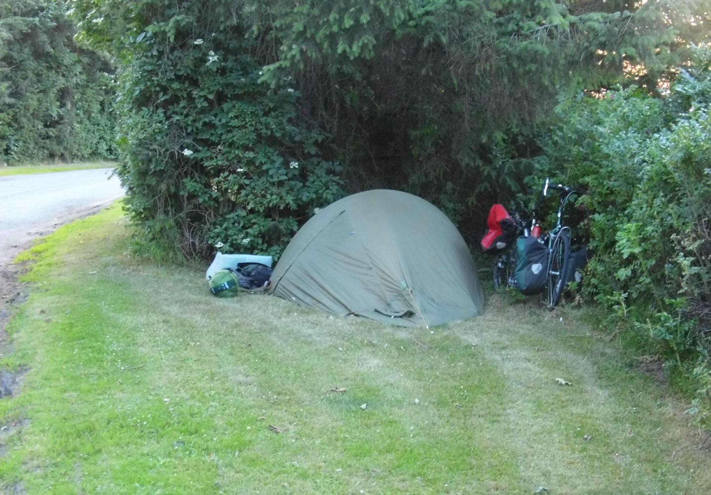 The rest of the day is nothing much to write about; riding on a narrow strip between the white line and the edge of the asphalt for much of it. This evening I write this sitting at s table in another rest-place. There's a level lawn with a high hedge at the side providing cover from the road where I'll put the tent up come dusk.