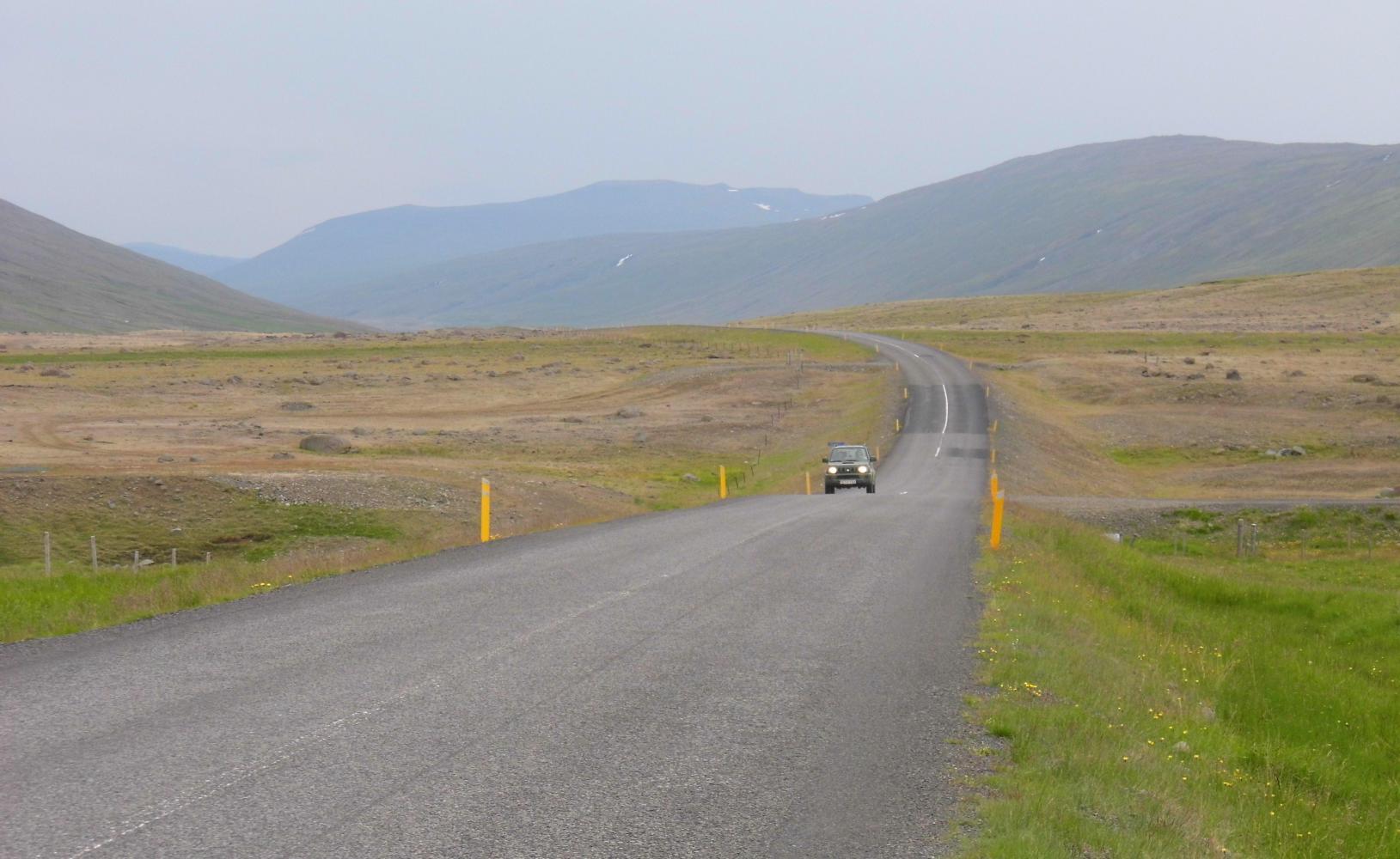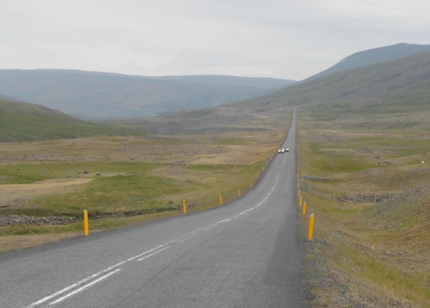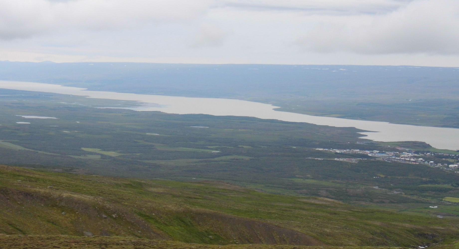 Then the road went down, below the cloud, whereupon a few of the campervans had pulled over at a view-point which looked down over Egilsstadir and Fjotsdalur (valley) with it's wide river stretching off south towards the rounded top of Snaefell (Snow Mountain), peeking over the horizon.