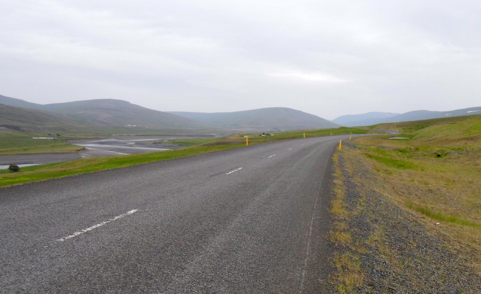 A dutch cyclist that had heard the weather forecast for the days ahead, informed me there was a lot of rain in the south for the coming days. With this in mind I turned south on highway 1, The Ring Road and cycled off into a stiff headwind. I could see it raining already over the hills to the south, whereas, back at the petrol station, there were occational glimpses of sun to the north. That was it. I didn't need any pervading to change my plan which I'd taken time to work out. I turned around and cycled back past Egilsstadir and continued north.