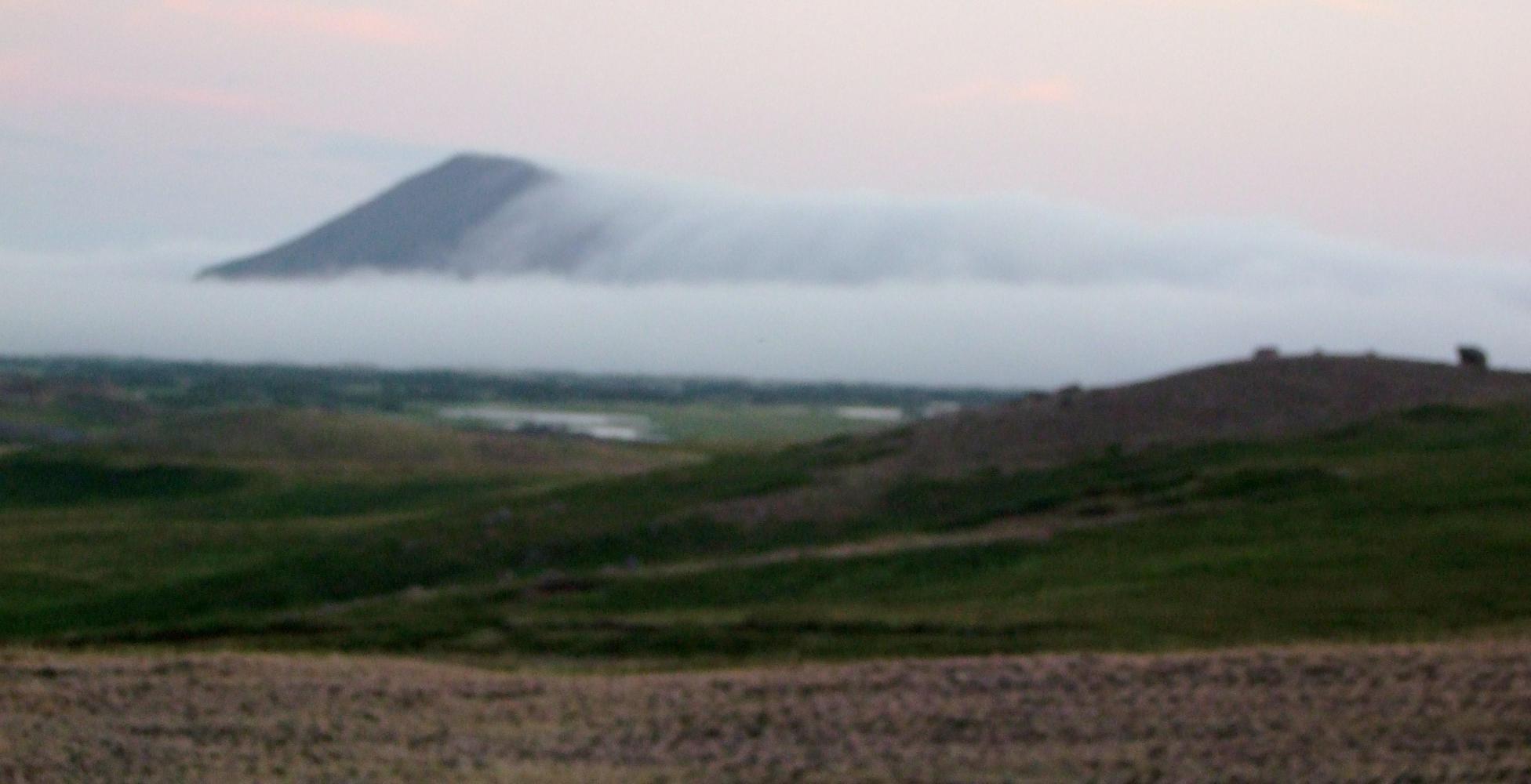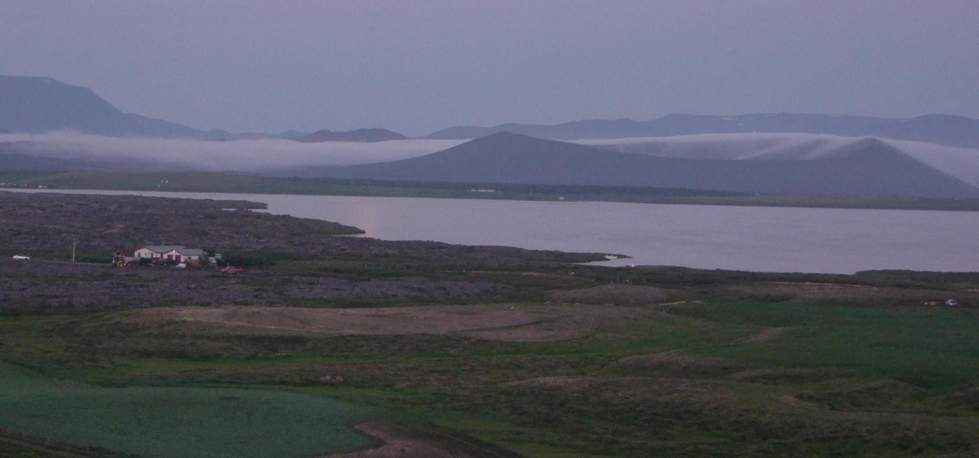 As I've said before, there is no night here; evening blends into morning. When I arrived at Myvatn Sunday just before midnight, the sun had gone just below the horizon for a few hours. I put the tent up and then set about cooking the last of the rice with the cauliflower I'd bought in Husivik for dinner. And while waiting uploaded photos to the computer. Later, an Australian guy told me the password for the Wi-Fi and we sat together at the table outside the locked campsite reception with laptops open. He'd taken a magnificent picture of Jokulsarlon (the glacier lake full of icebergs in the south) with red afterglow cotton-wool clouds reflected in the lake.