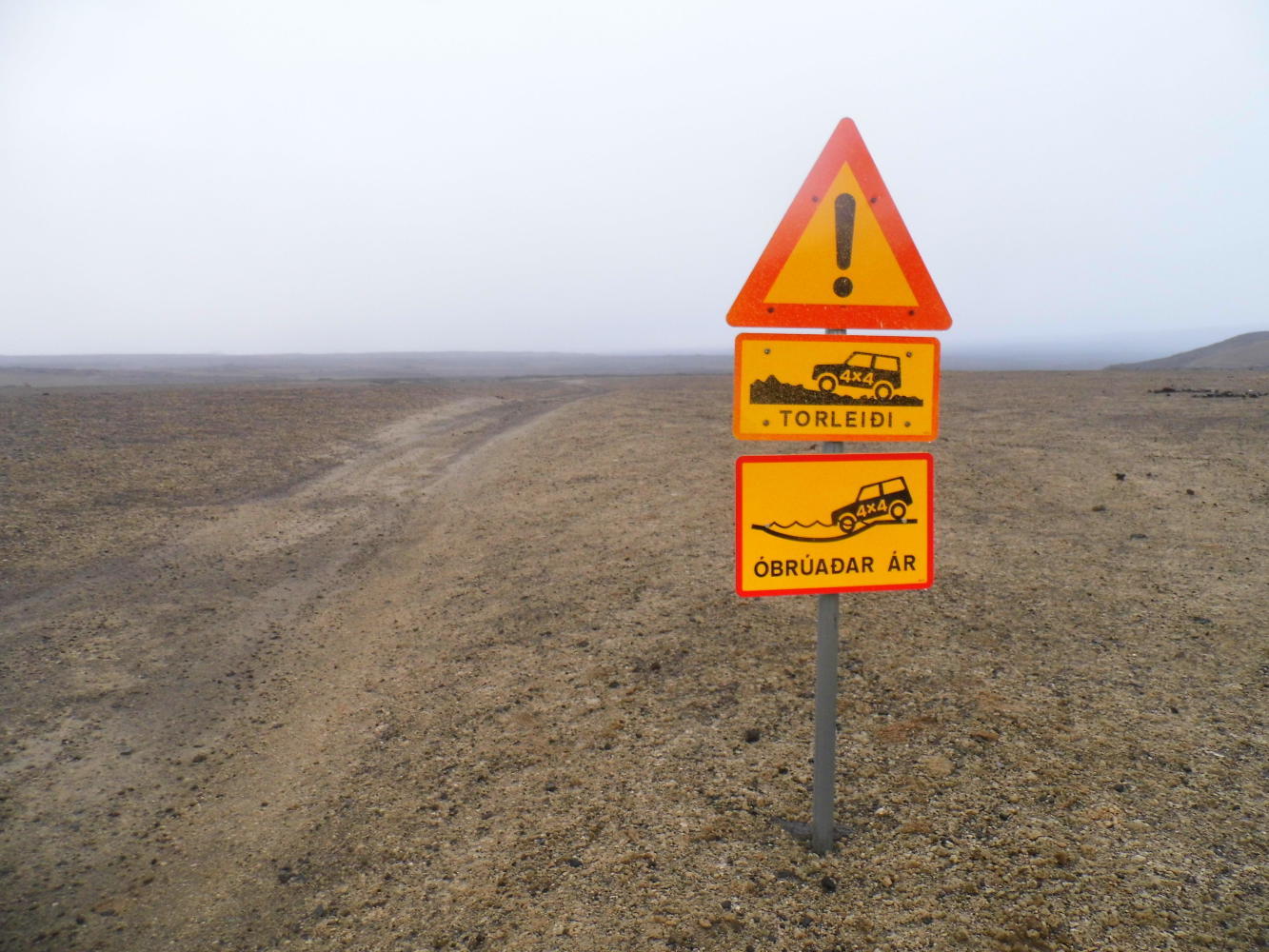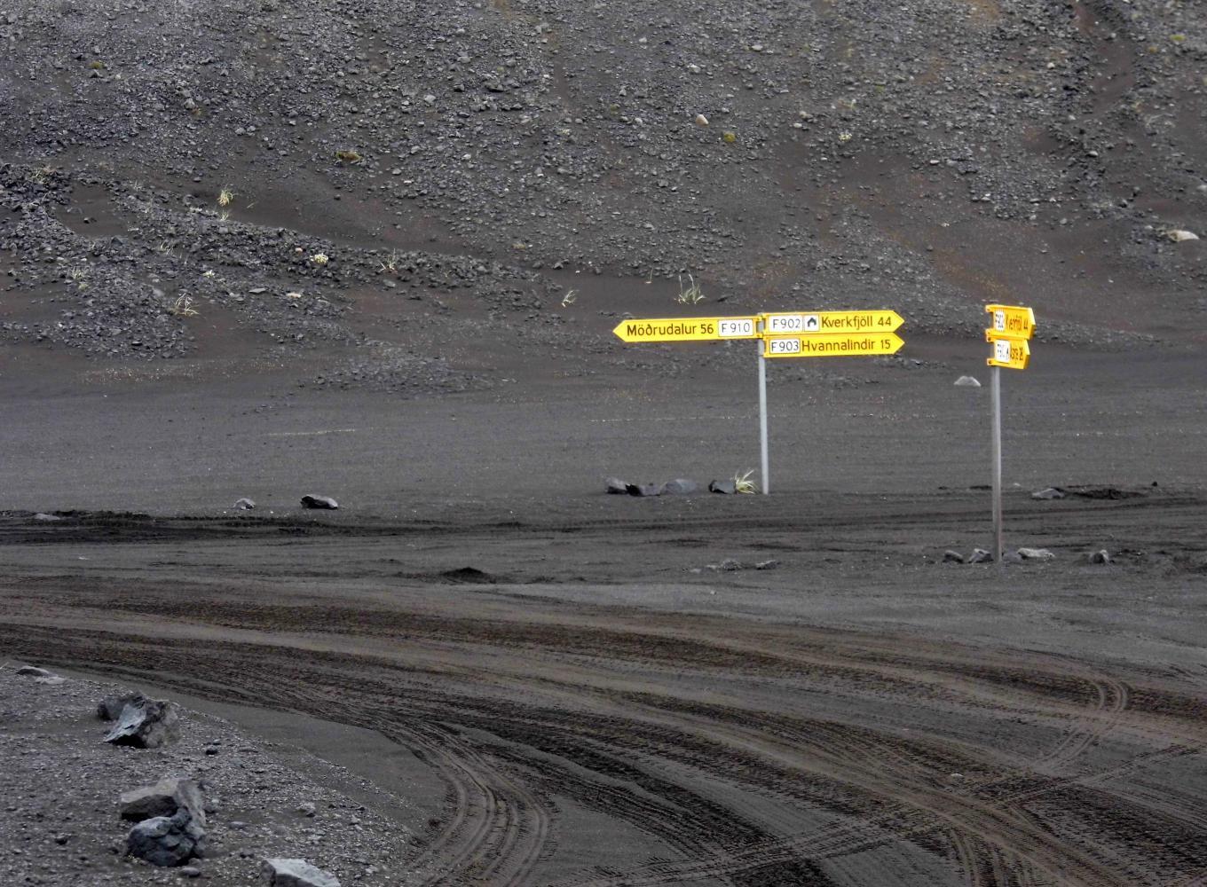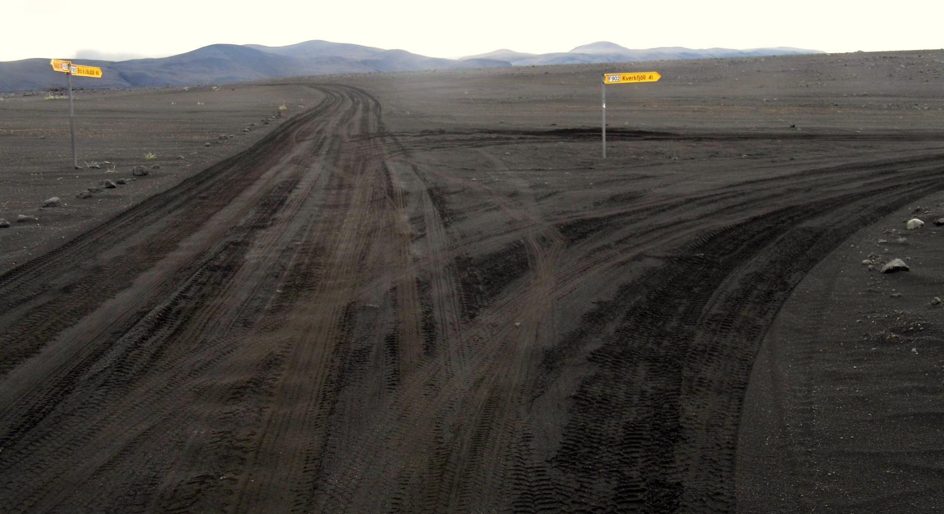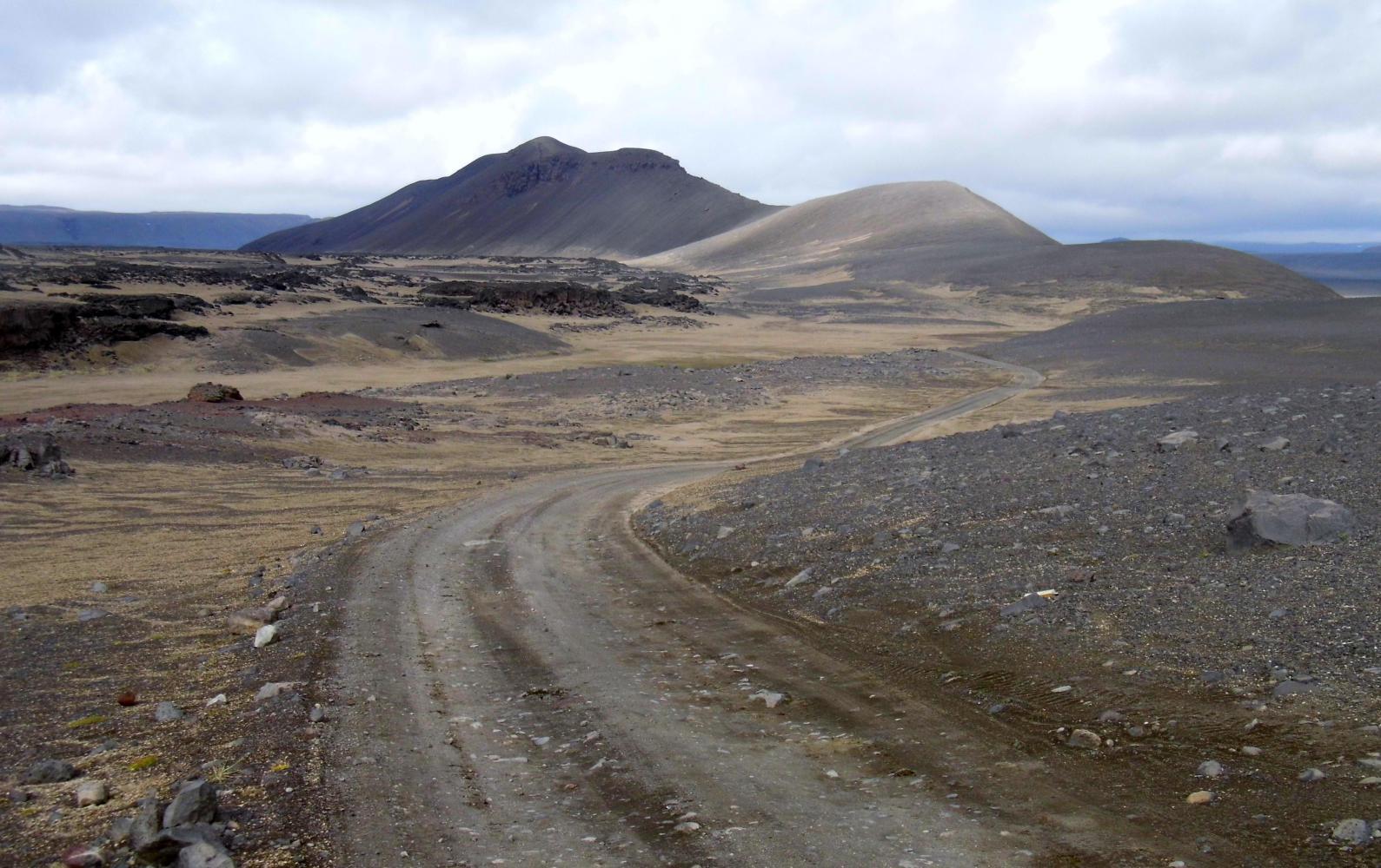 It wasn't raining this morning but was still raw cold in the wind. Having had enough of one day stuck in the tent, I decided to get moving and left Askja at nine, returning back, the thirteen kilometres to the turnoff on track F910, in which I got colder because it was all freewheeling downhill. From where, the track straightaway went uphill into a mountain of black sand and while much of it was somehow well pressed down by vehicle tyres and so I could ride upon, there were laborious stretches Is off pushing through with the wheels sunk in.