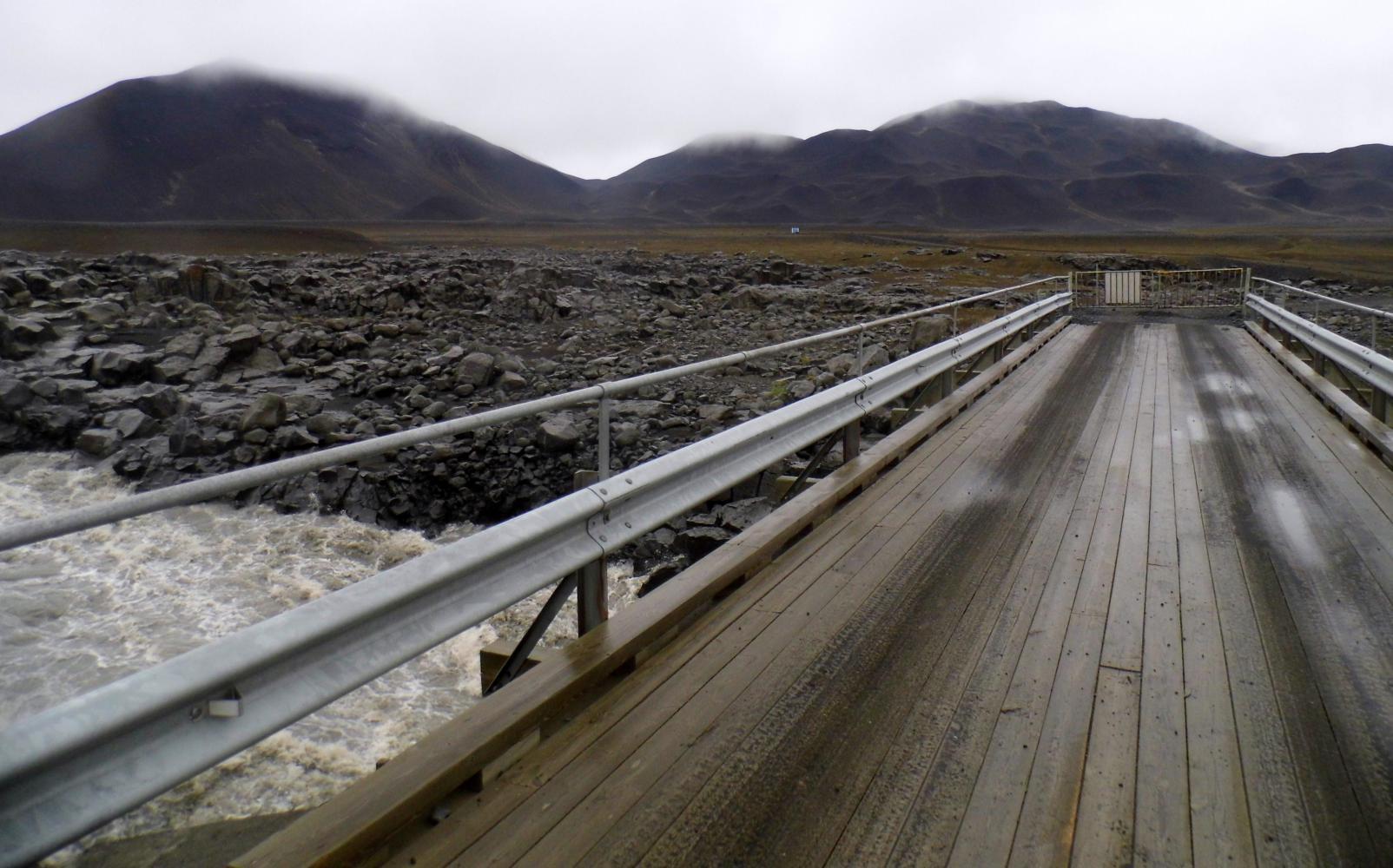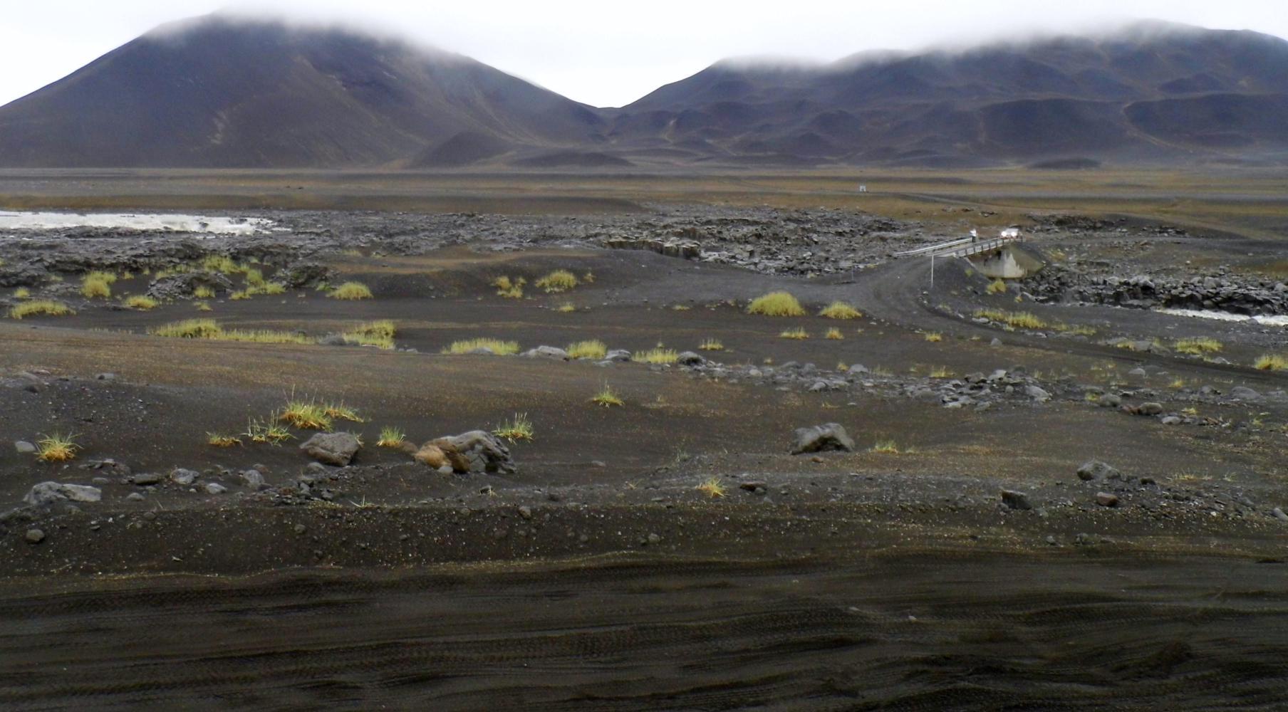 It was another few kilometres of riding and pushing to a turnoff for Kverkfjoll, then five more to the second turning for Kverkfjoll at a barrage of black hills where F910 turned left, from where I'd the biting wind in my face. And looking at the map was depressing, as the track held to a northerly direction the next forty kilometres, so it would be a long afternoon of fridge crosswind. Though it turned out not so ill: the rain which threatened over the hills cleared and around four, the clouds broke up and the sun shone, so I could stop for lunch without getting too cold. By then Is on rideable pumice and I lunched in the shelter of a big chunk of lava. On the map this area is called Kreppatunga, I think because it's the tongue between two merging rivers. At high places in the track, I could see Jokulsa a Fjollum on the left and hear it softly rumble along, and I could also see on the right, the watery line of its tributary, the Kreppa river. Soon I was at the bridge over the later, another roaring swift glacier river. I thought that before the bridging of the two rivers, this tongue of land in between was un-visited by people. However would they have passed these rivers.