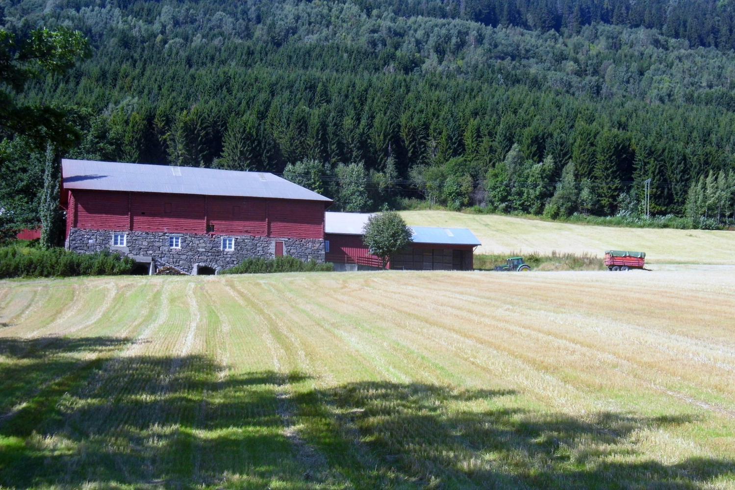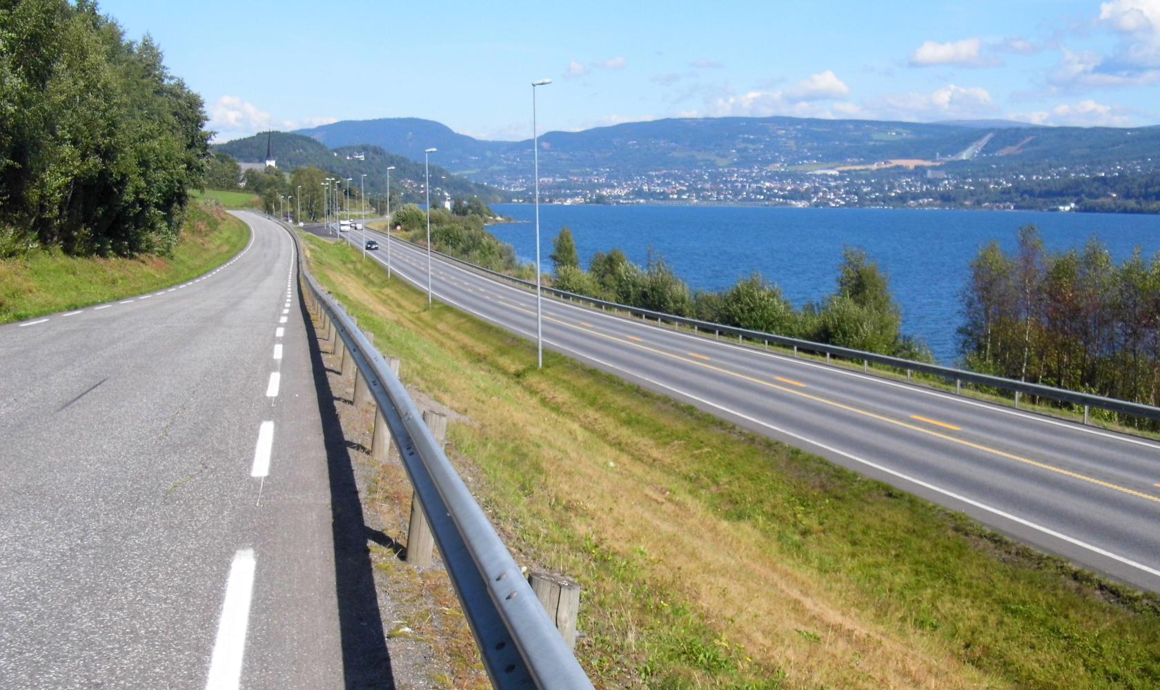 The next day started with more forest road then a long descent to Jeymaker, where I stopped at a Coop supermarket to stock-up for the day. Leaving town, I took road 245 toward Dokka. On the map, it went along a long strip of light blue, and the day can be summed up as riding along a deep valley lake, a landlocked fjord called Randefjorden. All day fluffy clouds were mirrored in the lake with the opposite side reffecting, upside-down wooded hills interwoven with squares of yellow grain-crops.