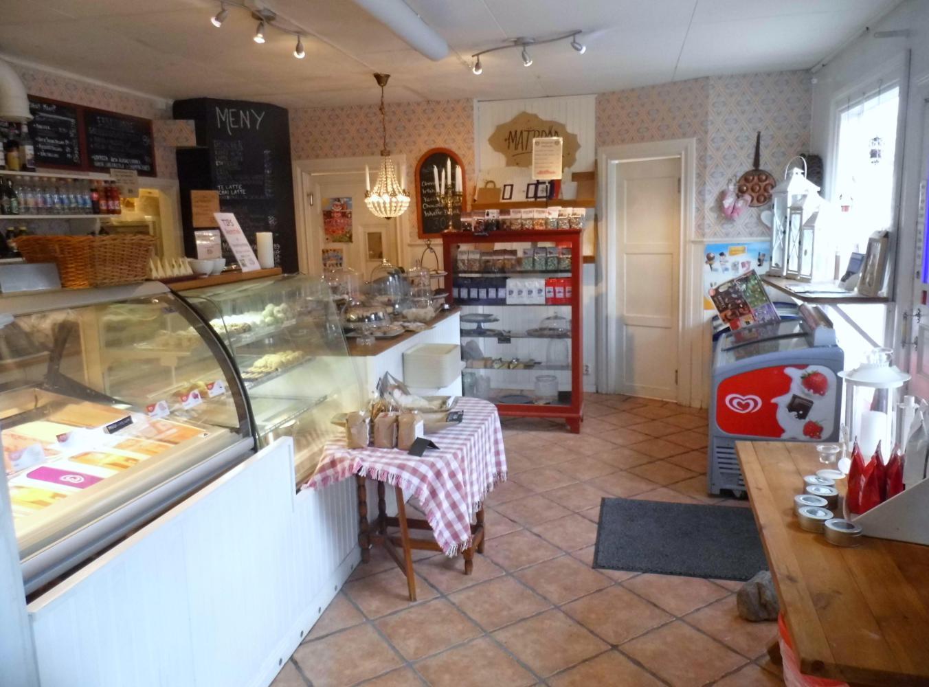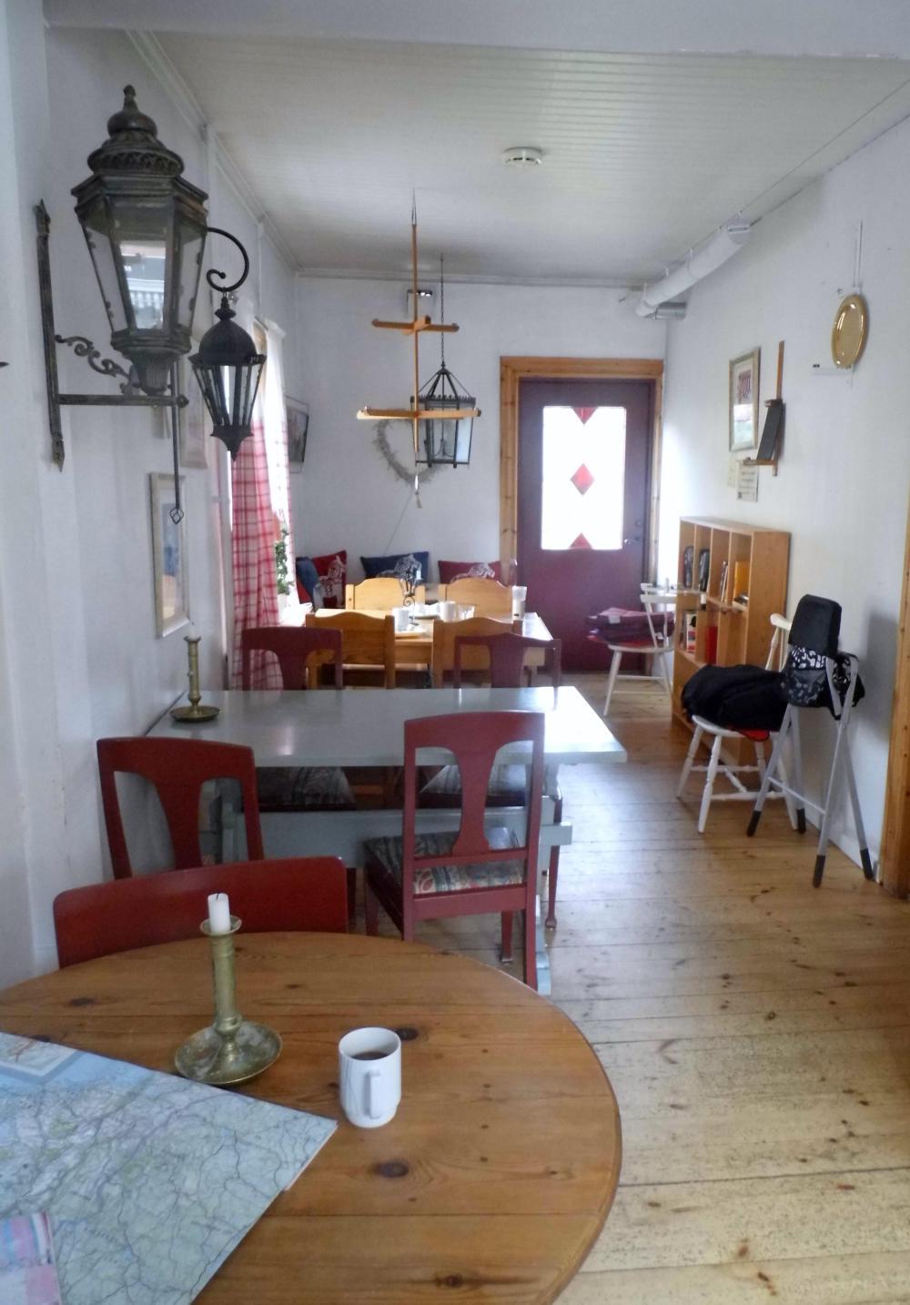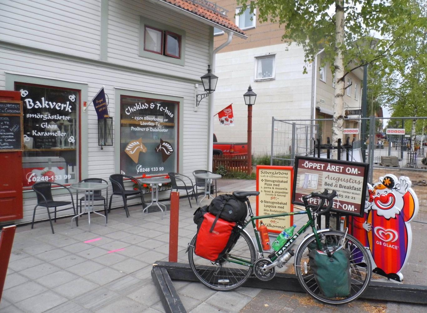 I was looking forward to reaching the next town Rattvik, thirty-nine kilometres south. And was relieved when I turned off to the centre at about half eleven. I first stopped at the ICA supermarket to stock-up on food for the day, then cycled along the pedestrian street of small local shops until I came to a café. An attractive wooden house with lettering on the windows and chalkboard by the blue stained glass door. When I entered through the door Is met by mellow colours. Wooden floor and tongue and grooved boarded walls. The multi colours of the ice-creams in the display-counter, and the pastries and buns in another display.