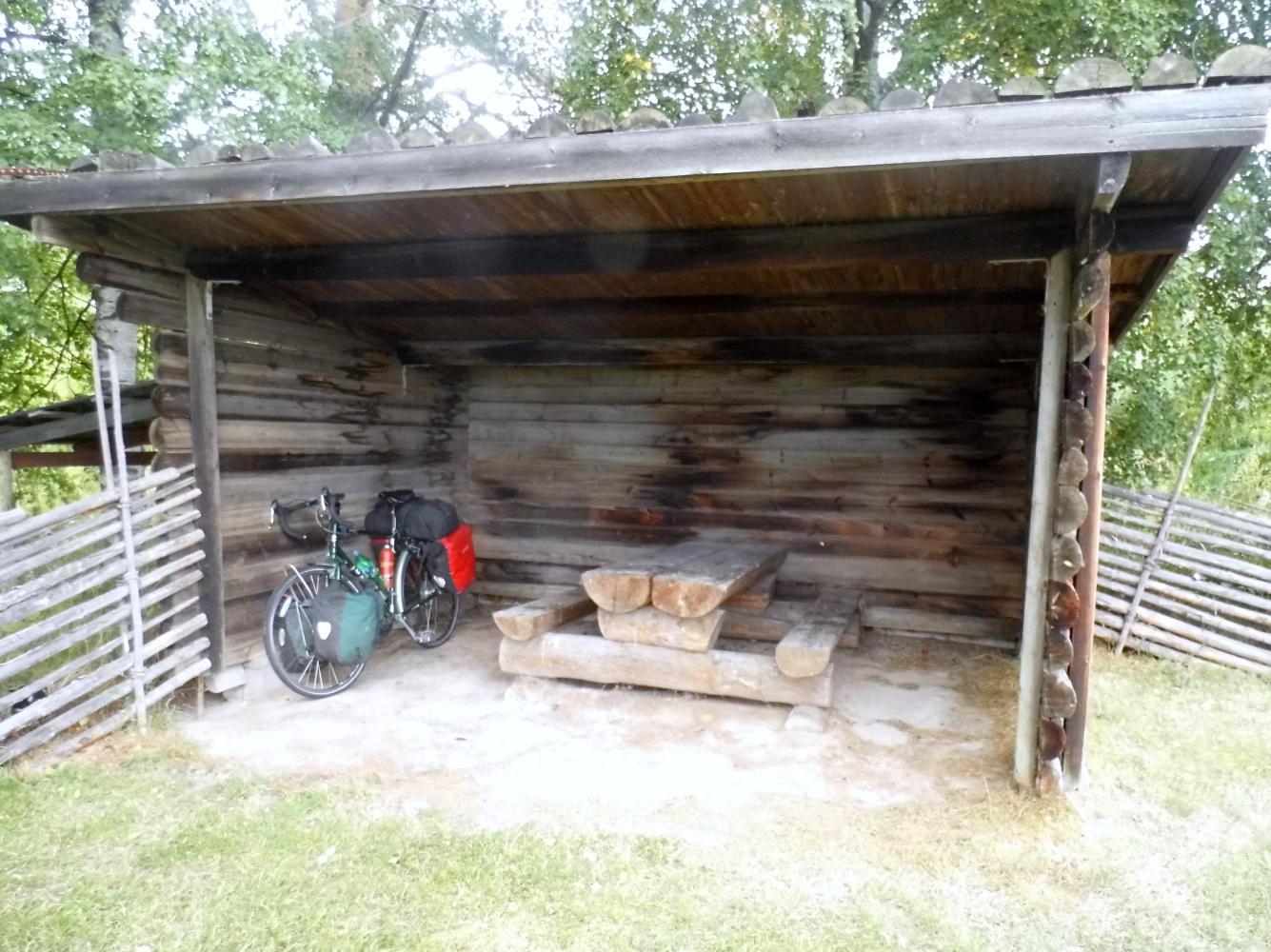 I lunched at a rest-place not far ahead, then the way onwards again rolled up and down through a corridor of trees and it rained, a brief shower when I took shelter in a bus-shelter. When the rain eased, the road then by-passed Farlun, which was extra busy and Is glad to turn onto a quieter road beyond the city; by now it was after six and I looked for a place to camp. There was a network of lanes into the forest which didn't seem to be much used, nonetheless, I found there were lots of little branches off to free-time houses, and there wasn't any level grassy areas to the side to put a tent, it was all pretty rocky. I persisted. I'd ridden two kilometre off the road on a stoney grass in the middle track when I came to a little clearing, far enough from any house.