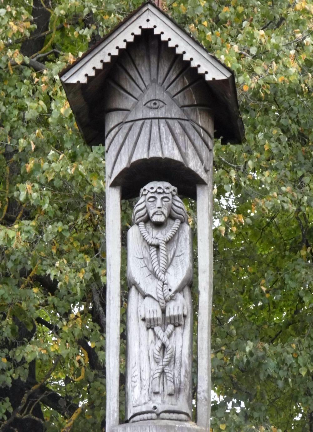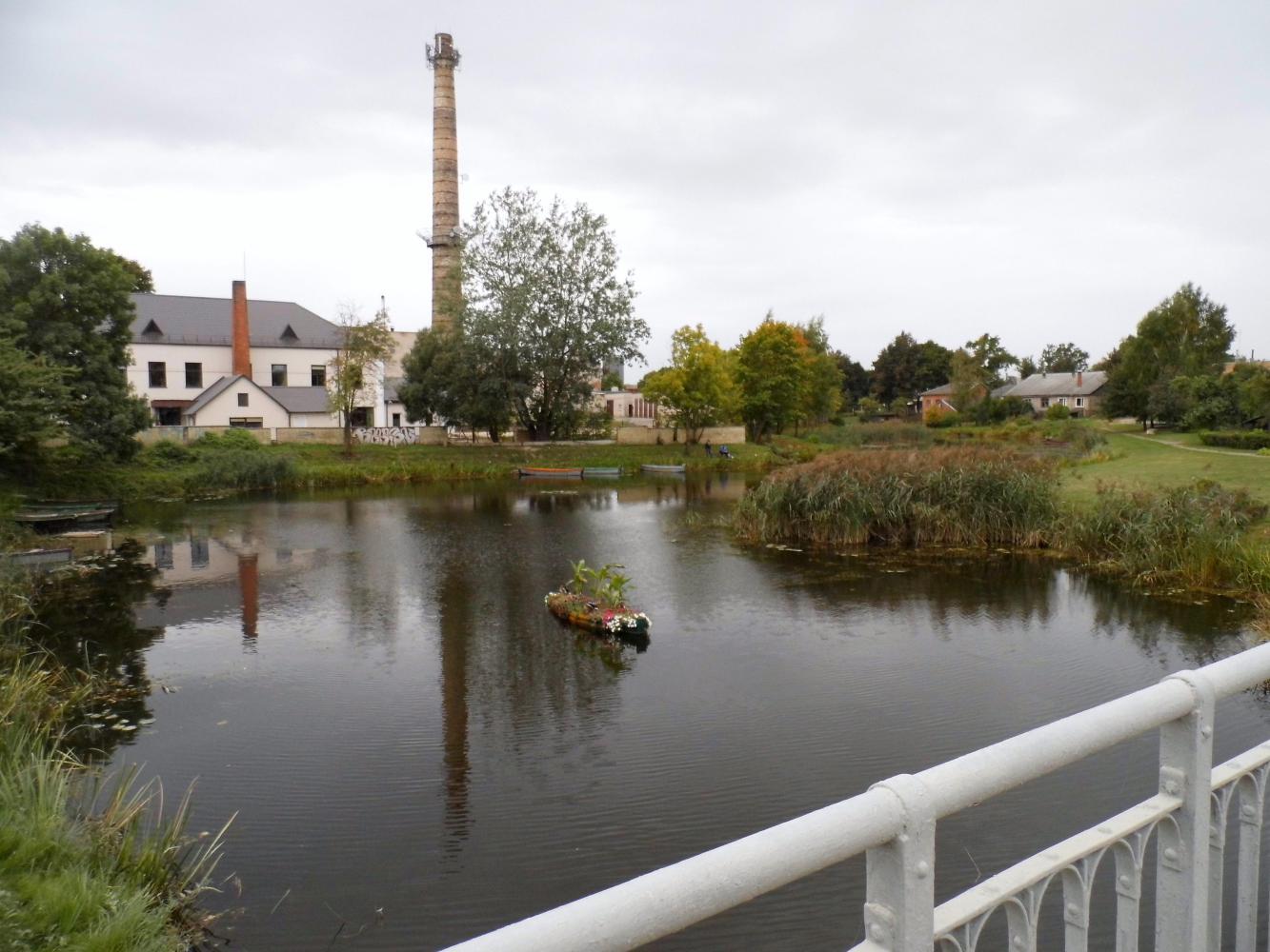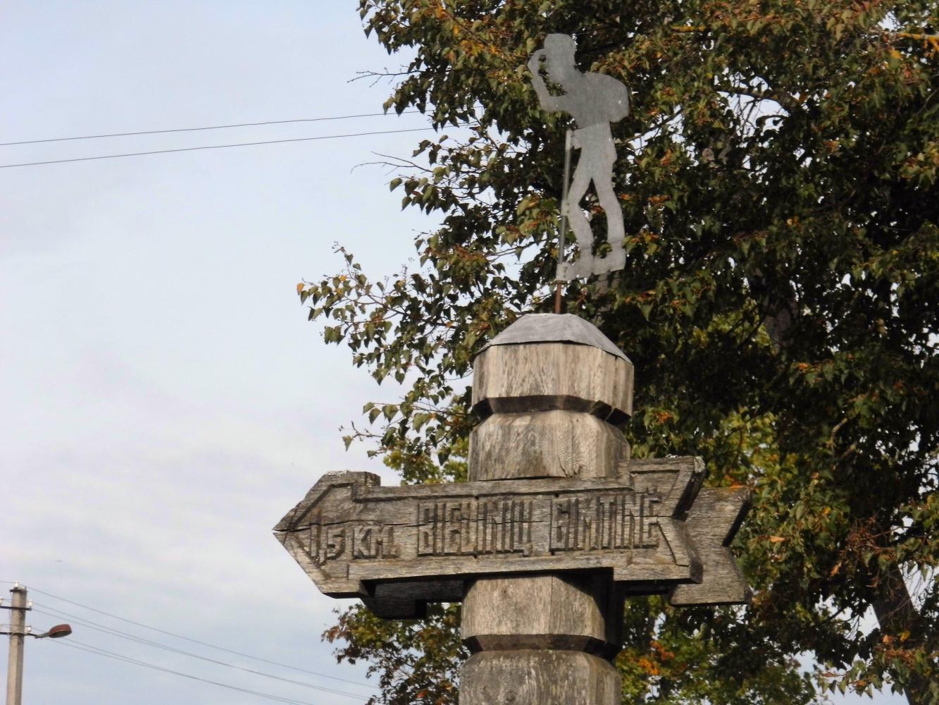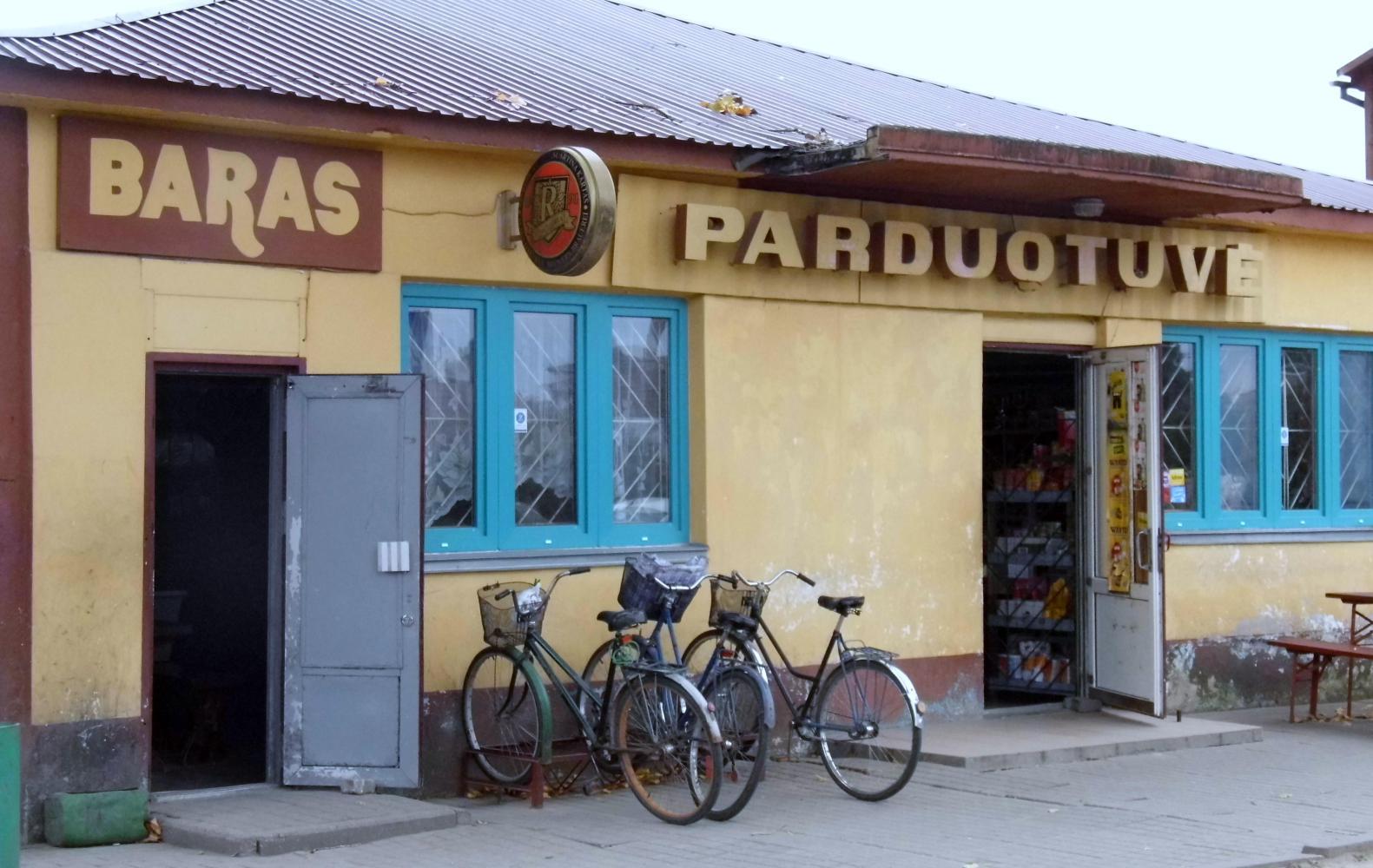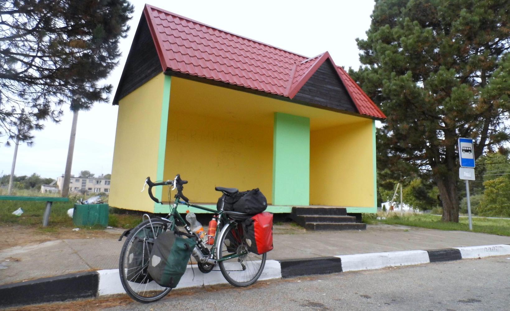 Back at the fork, I turned right and a few hundred metres on was back on track, crossing over a bridge and into Lithuania. The first thing I saw, at the side of a wide turning circle, was a bright yellow bus-shelter, elevated off the ground with steps up and with a pitched tiled roof. An inviting place to stop a few moments, so I stood the bike against the black and white striped curb and went and sat on the steps.