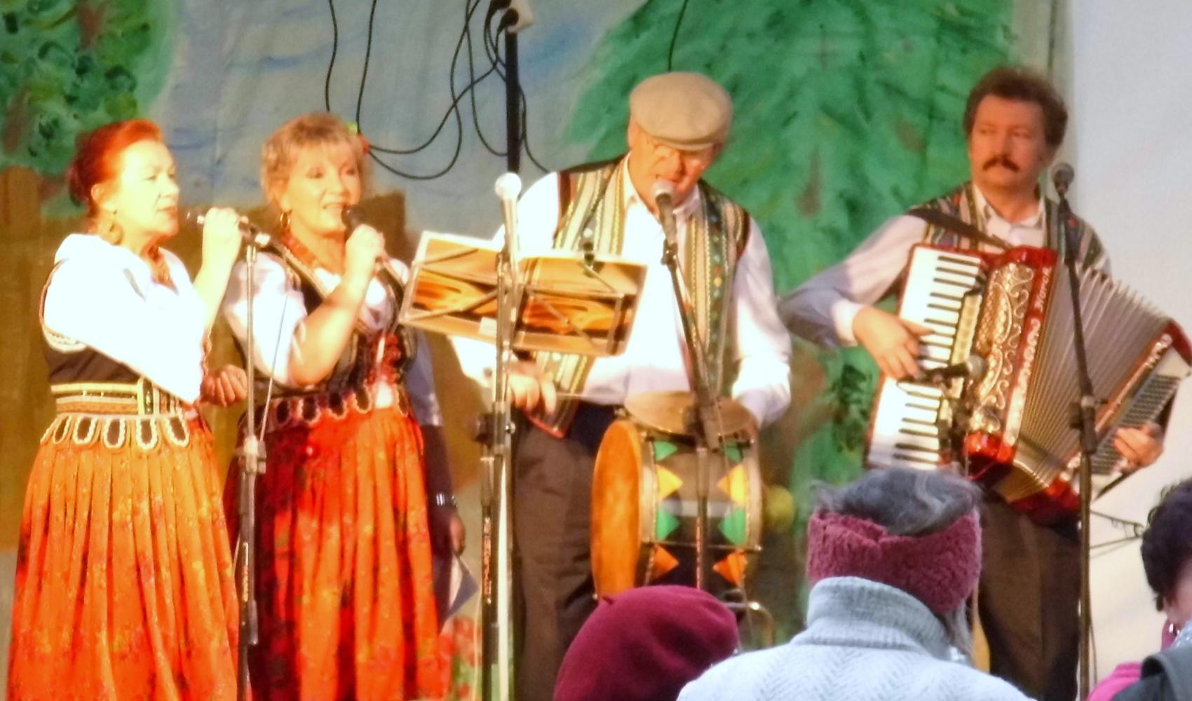 There follows the way into Pulawy with a big French superstore, a burger chain and a Tescos: a fair sized town with signs for places of historic interest to visit. I keep riding through and the urban spread continues well to the south which is now along a narrow valley with wooded slopes either side: the sort of country where it is going to be hard to find a level place big enough for the tent. But then comes the turn off which I had been intending to take. The road is for a place called Annopol and climbs out of the valley and sweeps down the other side into a river flood plain with villages and small towns ever few kilometres and open farmland in between. Not much hope of wild-camping. There is a patch of green on the map about ten kilometres ahead, which'll take all my time getting there before nightfall. I enter one town with a grand church. I hear music which I first think is from the church but as I get closer it sounds nothing like gospel; its more ump-paa-e. Then round the street corner, the way leads along the main square where there's a stage with a canopy to protect against the elimments. On stage the band is in what seems traditional dress. There's an accordion player with bushy black mustache, white shirt and waistcoat. Two female singers in wide flowing dresses. And the area in front of the stage is full of middle-aged couples dancing.
