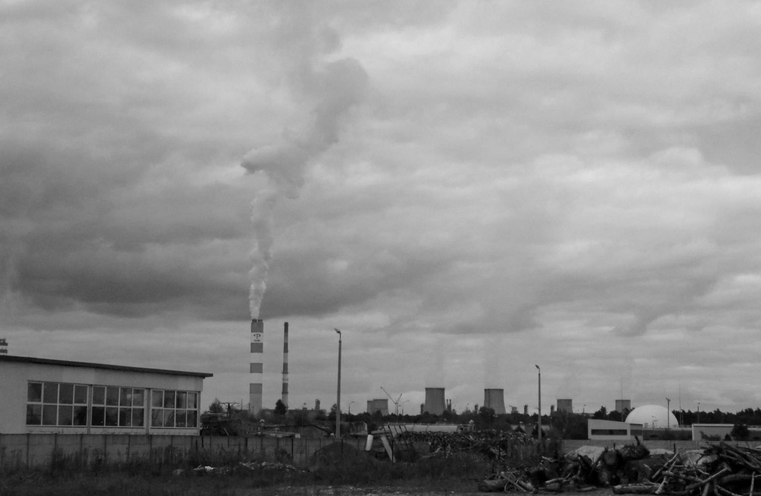 From Deblin I take the road south for Pulawy following a river to the right which is only visable in places through bog with cover of willows. Ahead to the left, there's a low wooded hill, beyond which I see a distant red and white striped smokestack with a wisp of steam going up like a twister into a long cloud across the grey sky. This is the view for the next twenty kilometres; the twister growing to a massive billowing white column until the end of the woodland reveals a colossal area of construction site, cranes, domes and a dozen or so cooling towers with vapour columns rising straight to the sky.