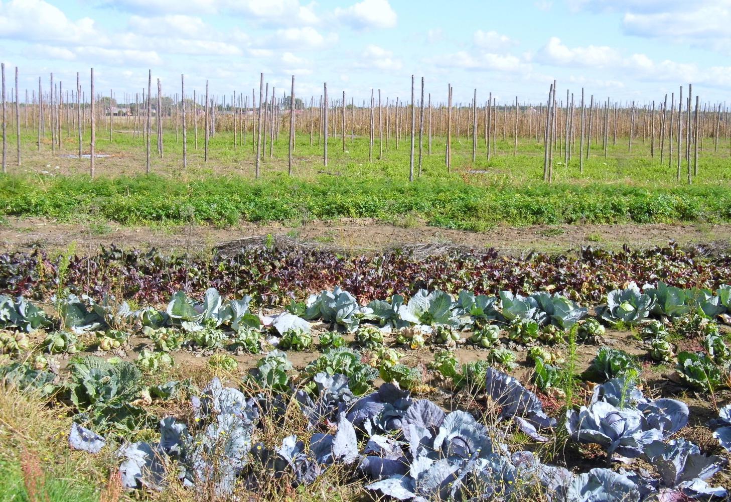 When I cycle on from the shop which is in a little place after the town Annopol, I turn right along a narrow road with a sign upon which there's a boat and another sign about a weight limit. The road is dead straight as the land is flat and open from the shoulder on either side and mainly stubble left after harvest, but there's also plots where there are rows of hop-poles, lease that's what I think they are. One middle-aged couple with bicycles parked at the roadside are stripping out dried-up hop-vines at one plot. There are also small plots of vegetables.
