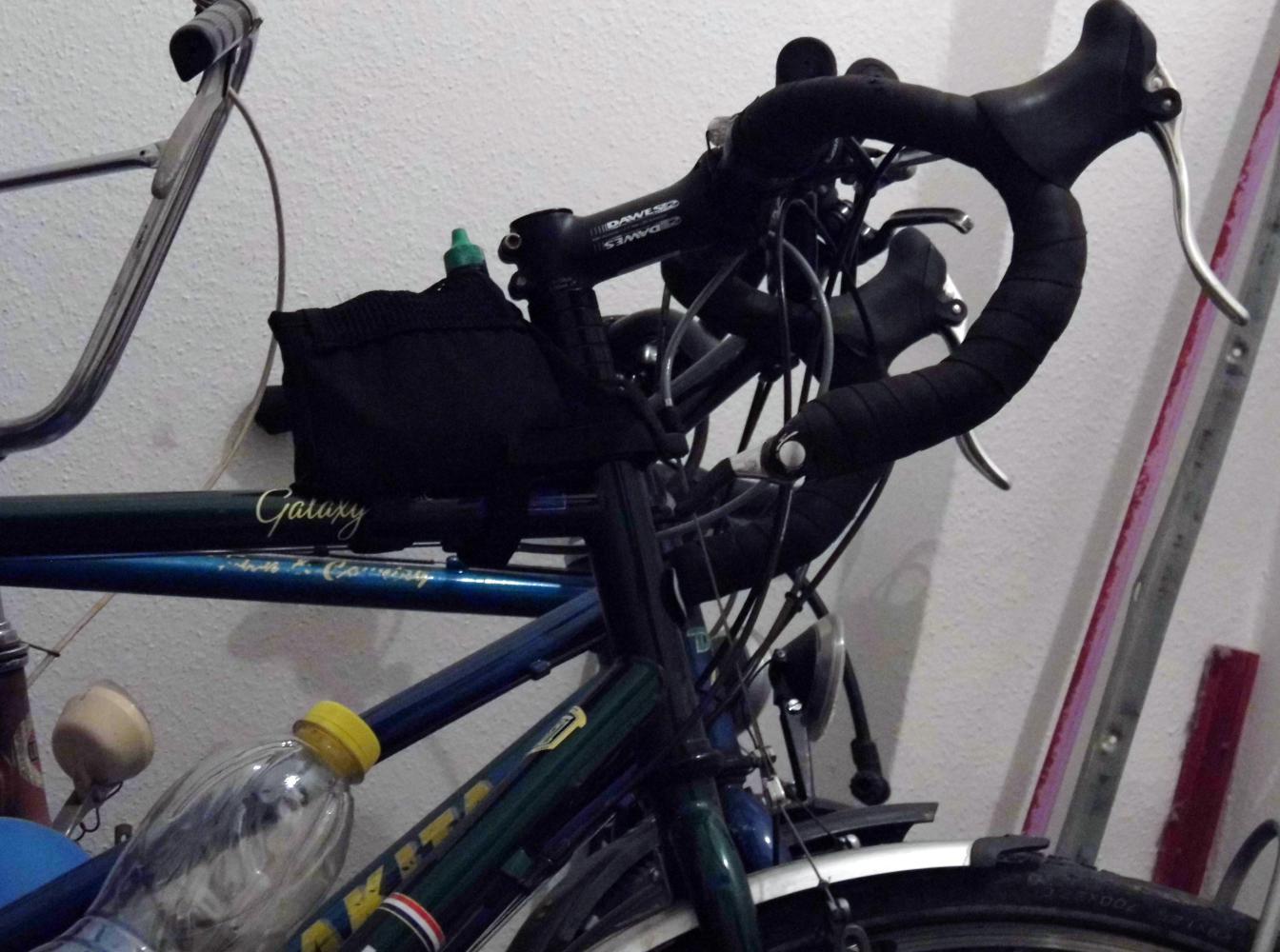 The bike-shop has a wide selection of accessories. I buy the brake-pads I need; also a small Top Peak bag which attaches on top of the top-tube against the handle-bar stem with Velcro-straps. I'll use this for a spare inner-tube, tyre-levers, puncture-repair-kit and chain-lube, as it's nice to have these at hand. I hate going into a pannier at the roadside when I've a flat, or the chain suddenly needs oiled.