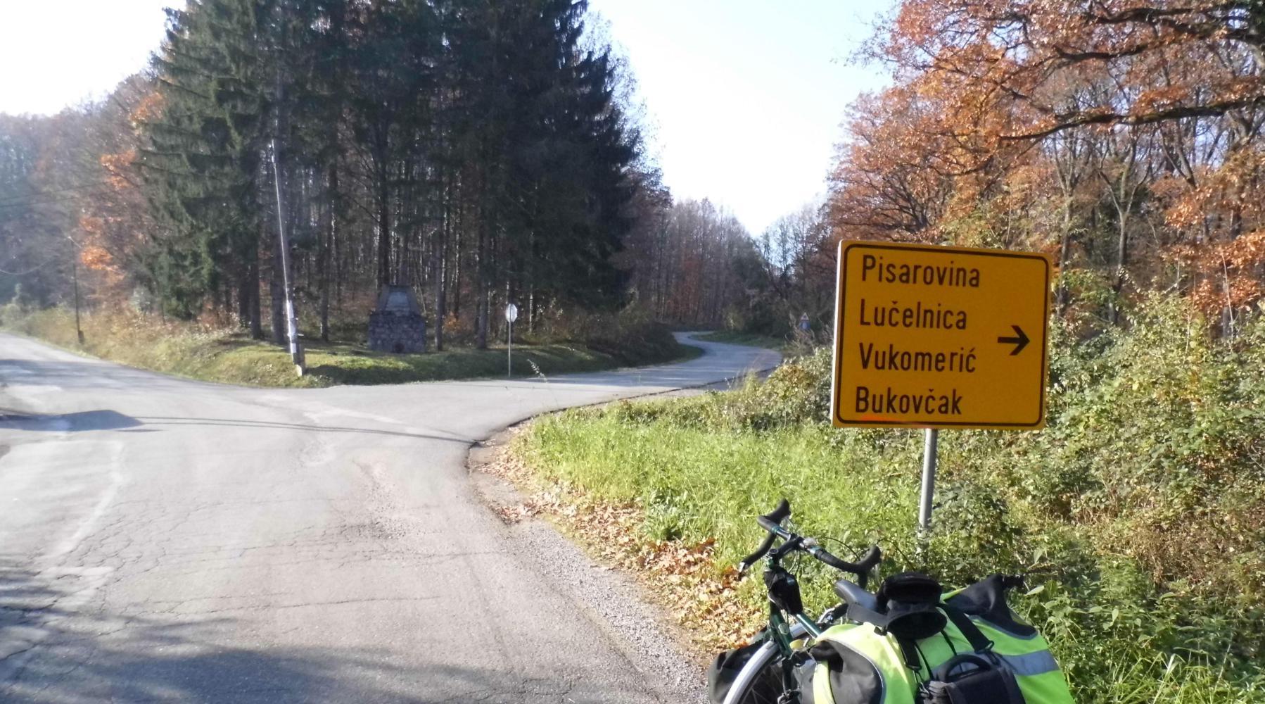 The street passes Zagreb concert Arena, tenement blocks, a Lidl supermarket and gradually out through a string of suburban villages to a secondary road with little to no traffic in open countryside. By now a veil of greyish dark blue cloud has darkened the sky and it grows cold, so I stop to put on my rain-jacket hoping for the best. The countryside is flat, looking like Hungary and I really don't have a clue where I am while passing through a number of small places too small to appear on the map. Further on there's rusty leaved woodland either side and I leave Hungary behind as the way climbs into the hills and the sun breaks through as the cloud clears.