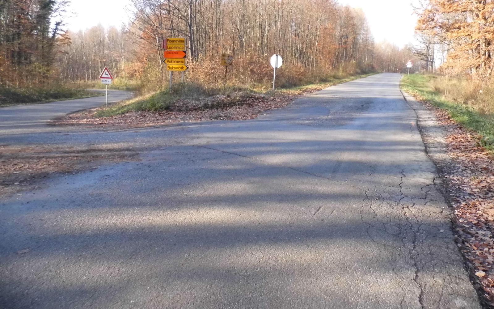 Well the white road on the map is a little confusing, more so as it is where the map folds. It splits in two and then looks to come together again. I am heading to Pisarovina when I come to the split in the road. Pisarovina is down the hill on the left. I decide to continue straight on as it means remaining up on the height with the view on the left. Though not for long does it remain high up, as two kilometres on, the road swings right and descends steeply into a wide agricultural valley and into the scattered village of Bukovcak. The road narrows as it turn this way and that way passing detache farmhouses with dogs barking at me, but with few people about. Reaching the other side of the village, the road come to a sudden dead end. There is no other way but back up the hill to the turn off for Pisarovina.