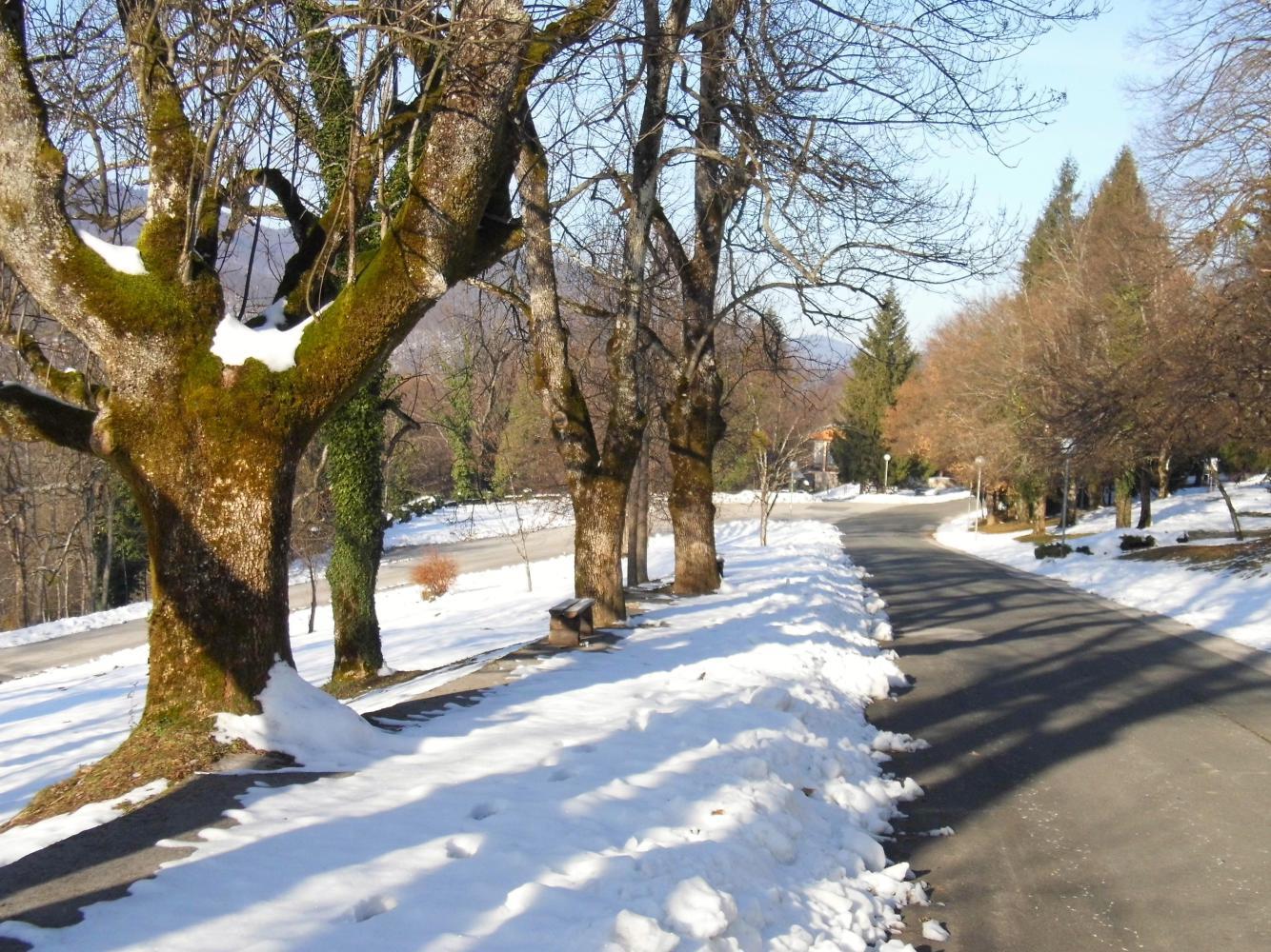I push the bike in off the asphalt over the snow, careful not to step on the glassy parts previously trampled, which would result in my feet sliding from under me and falling on my backside. I lean the bike against a wall and lock it, then step down steps, again mindful of the danger of stepping on slippery parts, down to a path, which is only the start of a long path zig-zagging down the gorge to the parks attraction: the Plitvice Lakes: a series of lakes beginning on the river high up in the gorge: the river cascading down from one level to the next between lakes, like steps, as pictured on the interpretation board by the park ticket office at the first hairpin bend on the path.