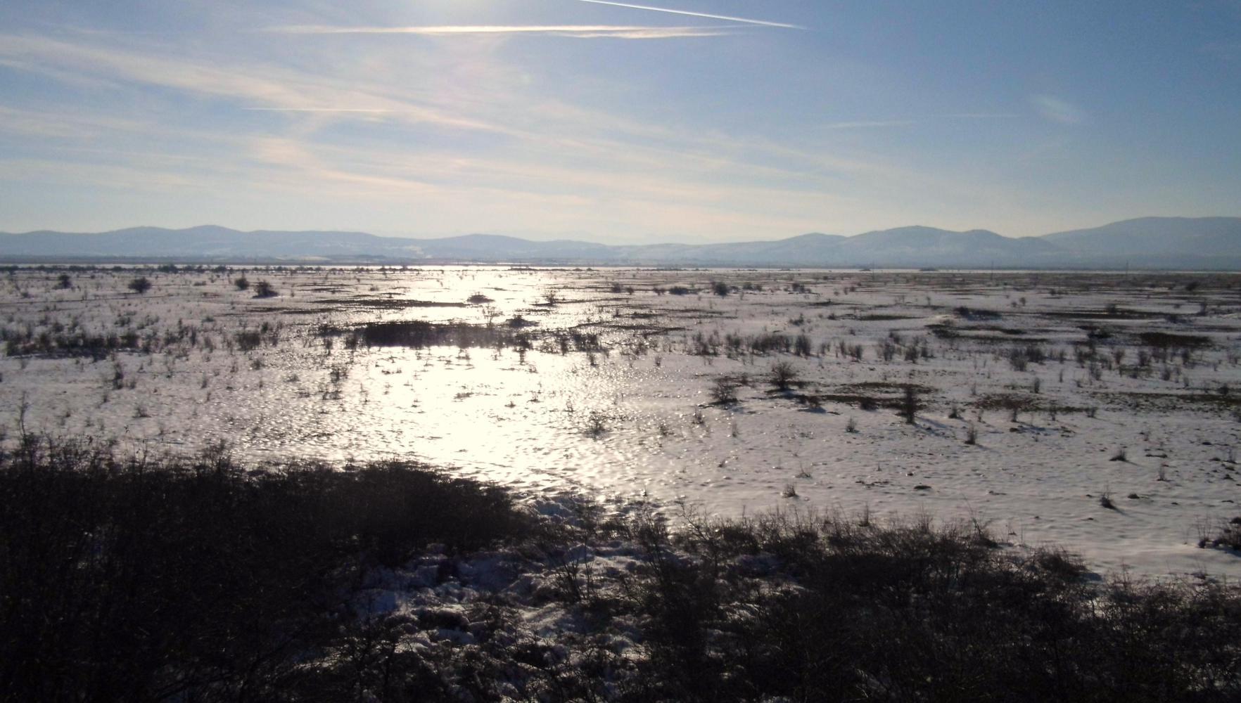 There's plenty of open ground on either side all along; lots of camping possibilities in among low-growing trees with only a bit of snow. I want to press on until dusk knowing that'll it continue so. Then ahead of me, there's a flock of sheep in a field on the left, a few of which have wondered out on the road. When I slow to pass round the sheep out on the road, I see through the corner of my eye two sheep come running towards me from the flock in the field. But in the next instant, I see they're not sheep but two dogs. They reach and run out on the road with stripped teeth barking and I've to get off the bike otherwise, the big white dog would go for my leg. I grab a handful of gravel from the side and shower them with it. The black dog run back into the field, but the white dog is a real vicious beast and follows me along the road barking madly. I don't dare get back on and ride. That'd be asking for it. I walk gingerly pushing the bike along which is between me and the dog, grabbling gravel up from the side and throwing it while shouting go to hell. Once past a point, it turns and runs back to the flock of sheep and I get on and ride.