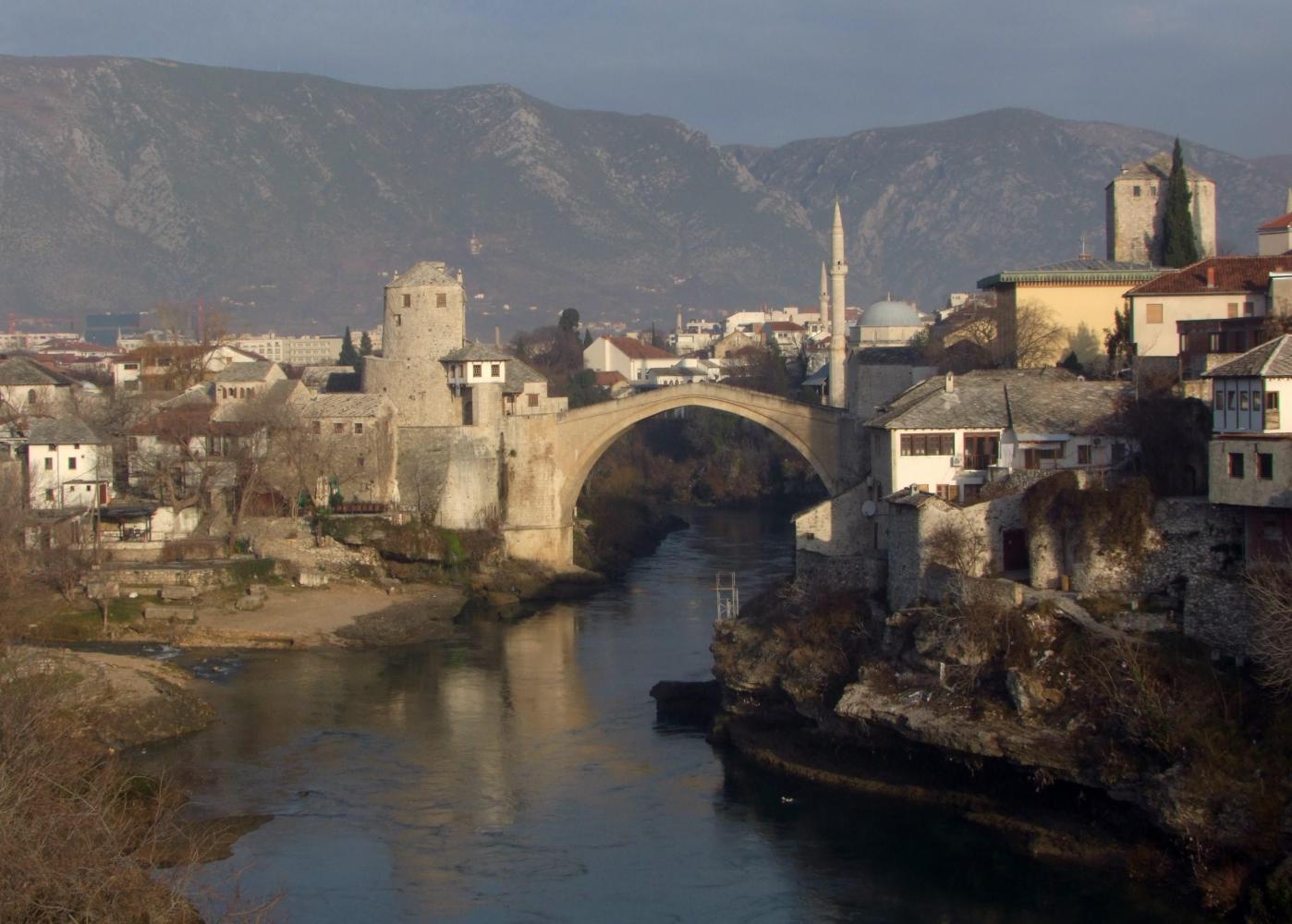 The guesthouse patron said it is only five minutes walk to the old town. Five minutes maybe if you don't get lost like I did. I know where the old town is from my previous visit to Mostar; but I take a street, thinking it's a shortcut; then, having crossed a modern bridge, Is on the wrong side of the river and have to do much walking to get onto the street leading down to the old bridge; across which, is the restaurant recommended by the patron.