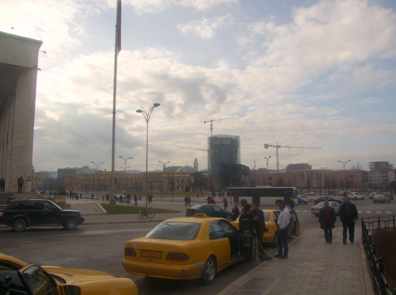 Another roundabout to cross without being rammed by an accelerating car and a little further I come to a pause by the curbside on the edge of a huge central square. There are stately buildings and monuments and a high-rise Hotel Tirana. And behind me a funfair.