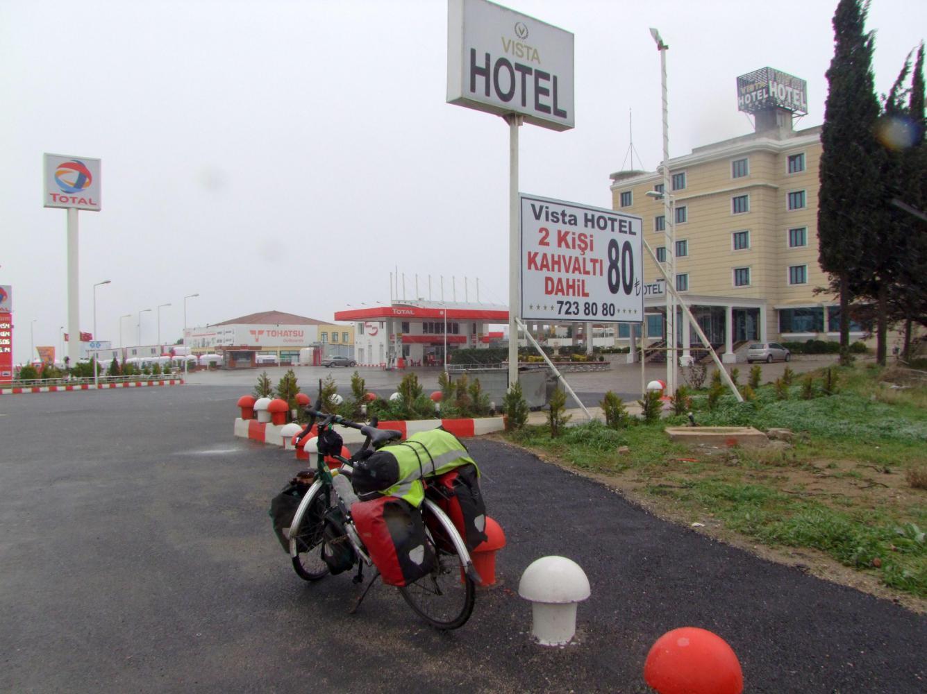 I've eaten my fill of white sheep's cheese and black olives, then rise from the seat and go over and grab hold of a bundle of two panniers per hand and the top bag and move awkwardly through to reception. There's unnecessary stuff in the bags which add to the weight and awkwardness. I'm glad at reception to set them down while settling the bill. Its possible to pay in either euros or Turkish Liras. I choose the later, so the receptionist looks at the euro to Lira exchange rate on the board behind him, then tells me the overall bill is 158 Liras... A lot more than I had expected to pay. Though hand over the money without complaint. Then pick the bags up again and carry them out through the sliding-glass-doors. Going out from the warmth of the heated lobby, the perishing cold straightaway smarts my face. And having put the panniers down, I grapple quickly into the front right pannier for my alpaca wool hat and gloves.