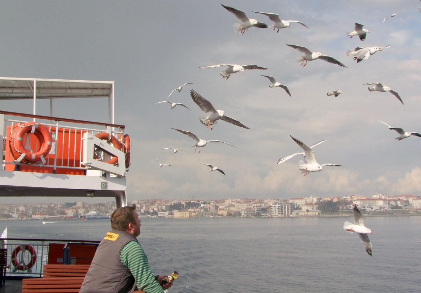 It is good timing to reach the ferry just as the last trucks drive on. I buy a ticket costing two-fifty for the twenty minute sailing, and push the bike on via the gangway to the side for foot-passengers. In the cafeteria I have more tea and a young man having seen me cycling asks am I cycling to Canakale. I reply I am, to which he laughs, then says it's thirty kilometres.