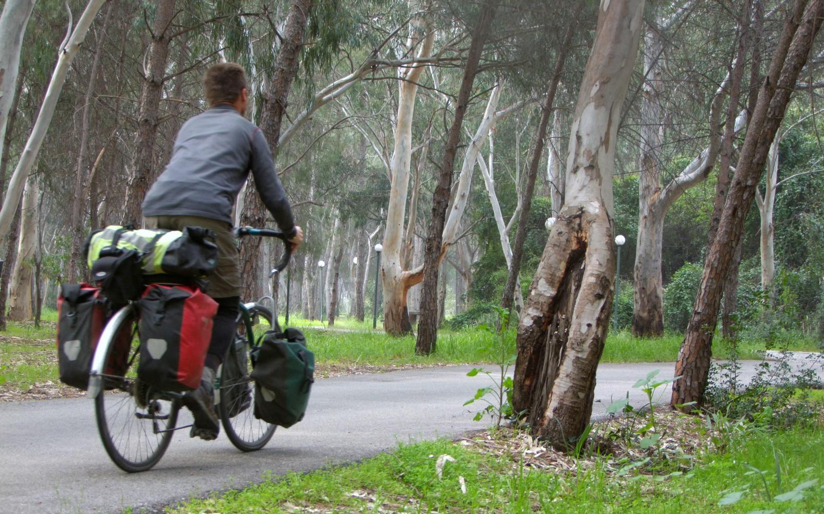 I remain at the café until well after ten, editing a page for this journal, then set off, following the tramlines from the seafront west. I meet with runners in twos and threes panting out of breath as they approach the end of some kind of running event. I remain on a small road along the shore which becomes after a bit a two metre wide path through a park going on for a couple of kilometres before leading out upon the highway that follows the coast. At this point I pass a sign: Mulga 420 km, which is fairly close to the ferry port of Marmaris. I'm surprised its so far as I thought it would be only three days riding at the most.