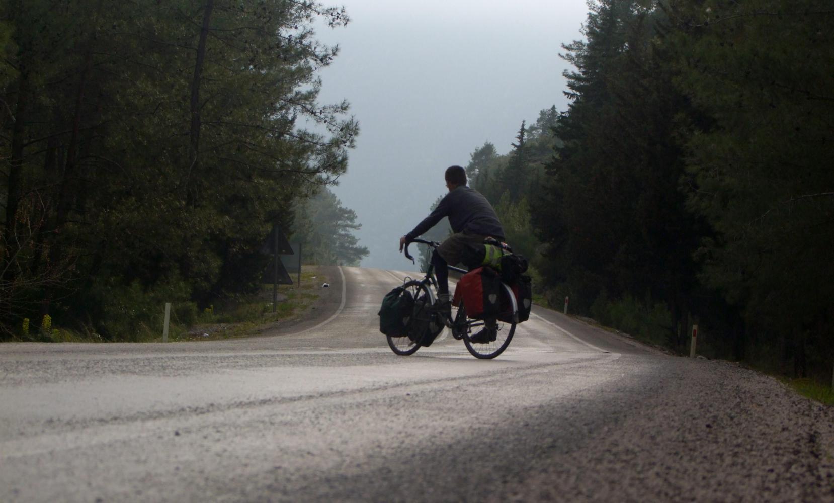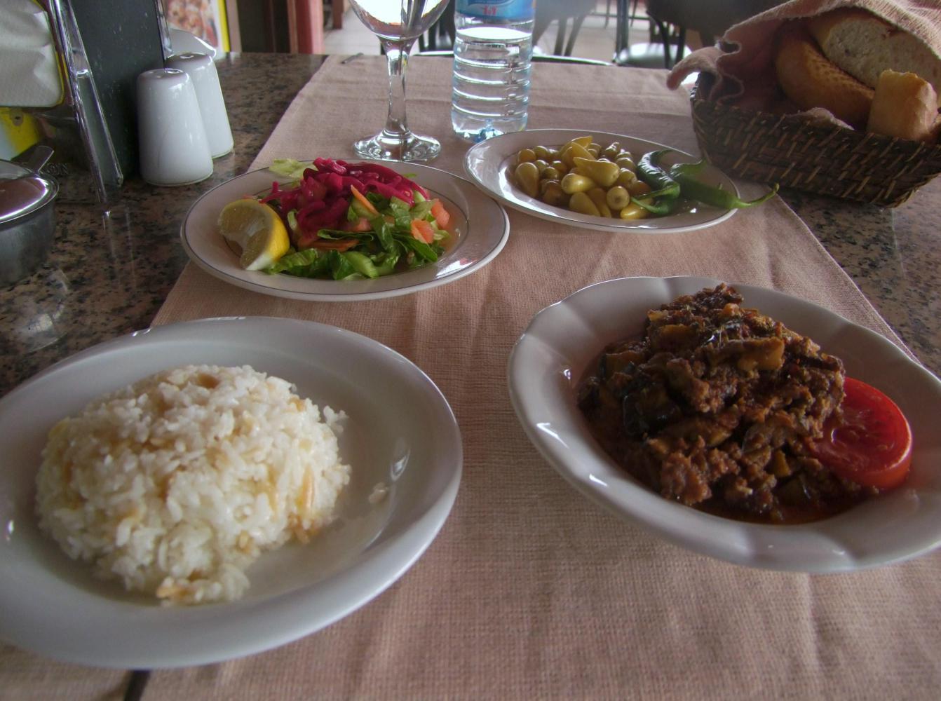 I reach the town of Kemer in time for lunch and straightaway come to a reasonable looking roadside café. There is one dish of the day, an aubergine goulash served with rice and salad and a plate of chili-pepper to spice things up. And of course followed by Cay and the friendly curiosity of the cook who ask me where I've cycled from and where I'm cycling to, also where I sleep.