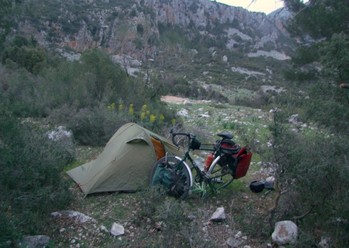 I come to a recently made orange-brown track, seems to be a service road which turns off up the hillside between clumps of scrub and trees and pass big boulders as it switch-backs its way up. I push the bike most of the way as the surface is stony and loose. Then eventually come to a level grassy place to the side and find a suitable place to put the tent hidden behind scrubs, in the unlikelihood a vehicle should drive up the track.