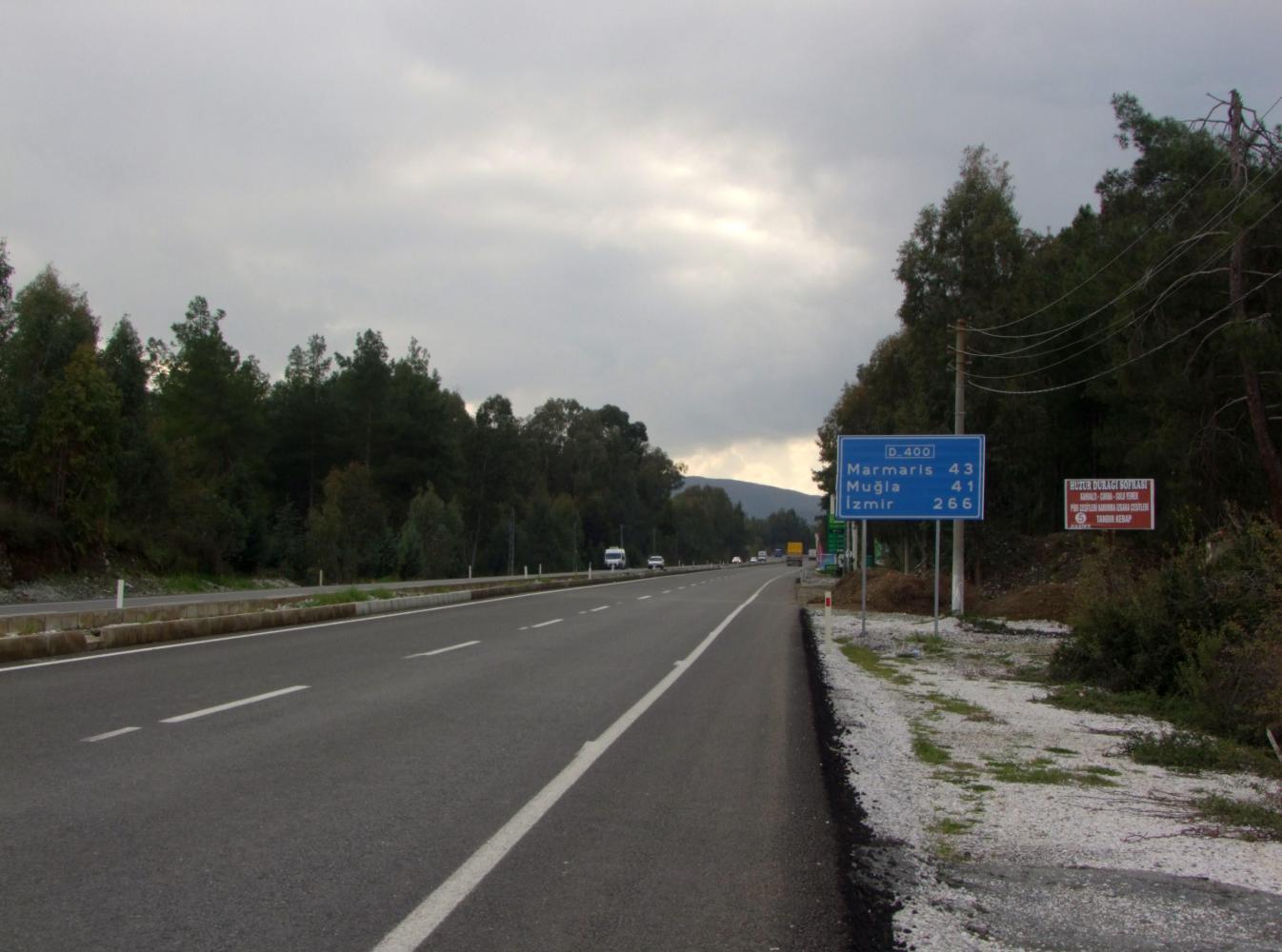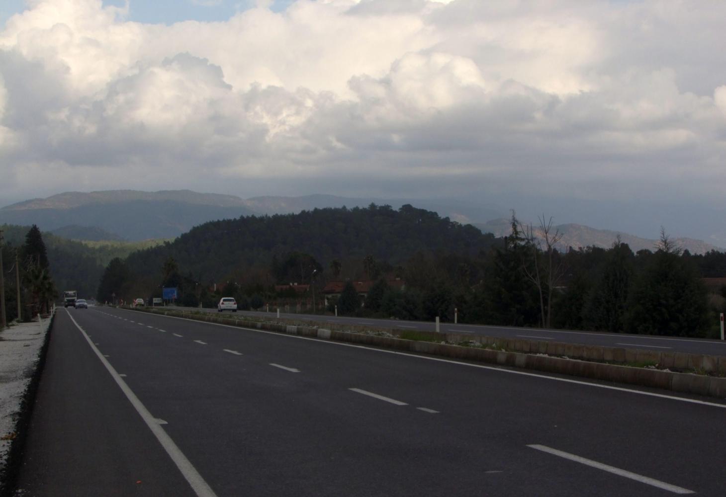 The road ahead has a wet sheen of rain and I'm glad I've missed a soaking today too as I see the dark vail of rain has moved on over the mountain to the right, while to the left there are broken white fluffy clouds. And soon there's the left turning for Marmaris toward that clearer sky.