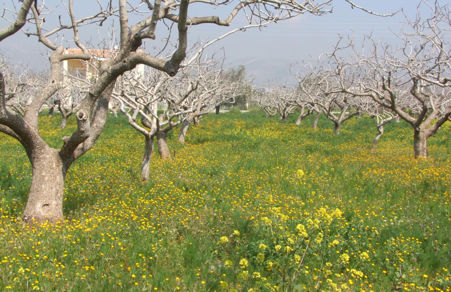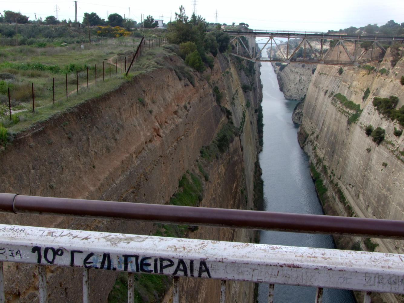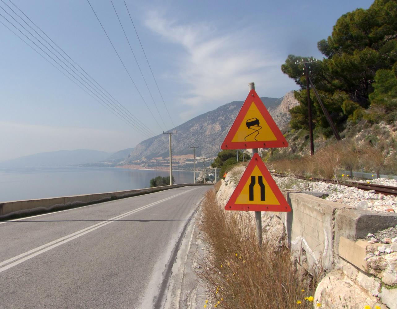 The road onwards is gradually uphill and reduced to four lanes with an ample wide shoulder and smooth even surface. Then over the crest of the hill, there's a longer sweeping descent with pine-forest on the inside slope and the coast at the bottom across the carriageway on the left. Without realising it the road has become motorway and shortly fans out wide approaching the first toll-booths. Here I follow a slip-road down and underneath to a tee with the old road, where I turn right, seeing the sign for Korinthos. I'm already in the countryside as the old road has groves of fruit trees with in-between a braze of yellow Spring blossom to the side for a bit. Then passes tight along the coast with old railway track and a sleep slope on the inside. Then pass an oil-refinery on the coast-side with the stench of crude-oil.