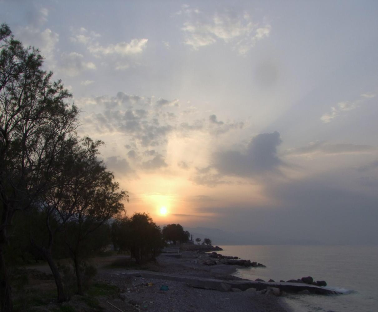 Beyond Korinthos, having passed over a channel so I've coast on the right on the way ahead which goes through one town or village after the next with a bad road surface, having all the way along had a continuous track dug up for utilities and refilled then roughly surfaced. I keep on going until nearly sunset by which time I've reached a small coast village with a beach-park; among the trees therein, look to be about the only place to hide my tent. I set the tent between two yew trees about twenty metres from the shore and after supper of bread and cake, lay down to the lolling sound of the tide lapping against the rocks.