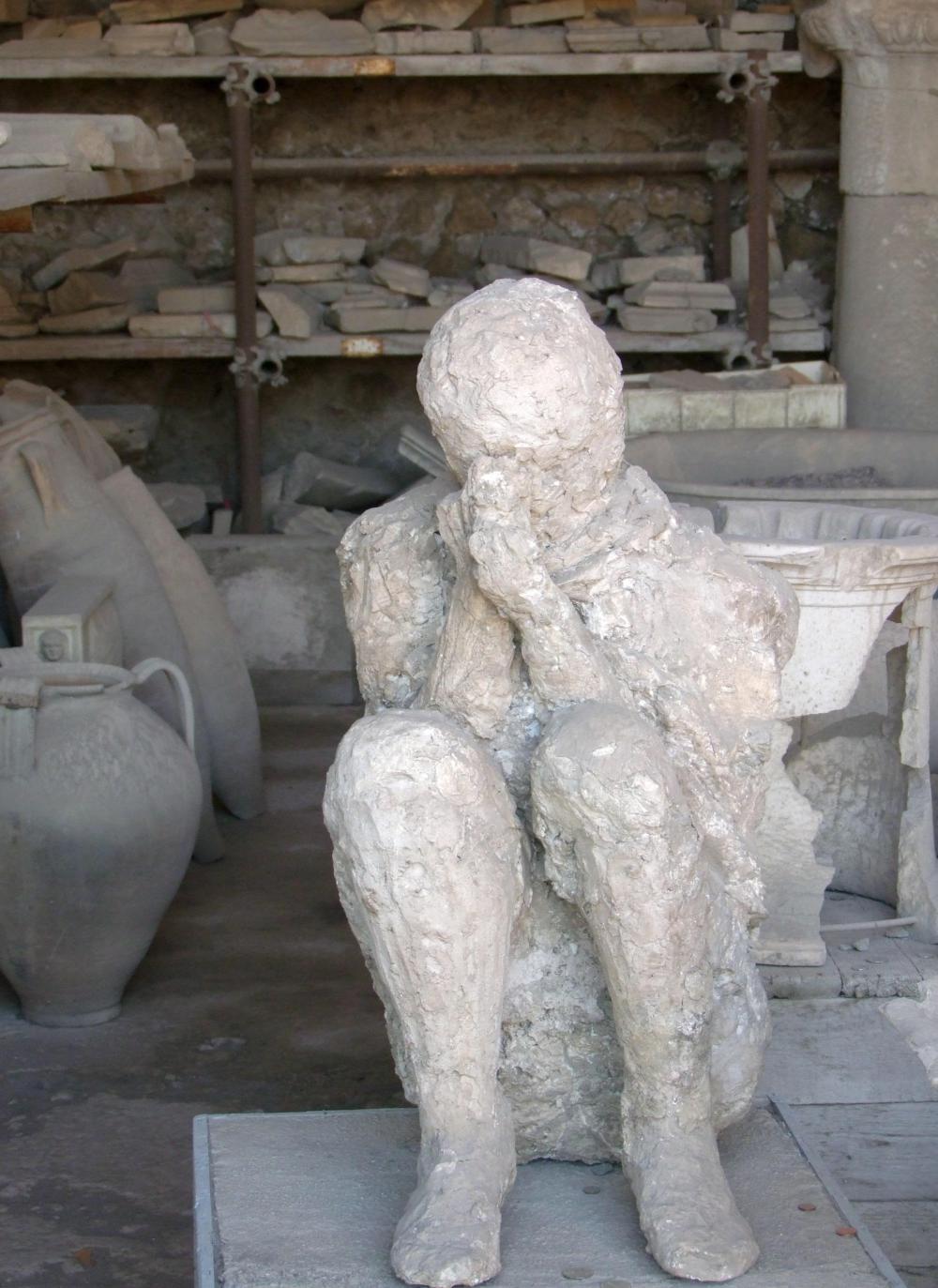 According to the booklet sold to me by the guesthouse owner, Mount Vesuvius did explode just before noon on the 24th of August 79 AD, sending a huge plume of smoke many kilometres high into the sky and turning day into night. In the hours and days which followed, poisonous gases descended upon Pompei, suffocating every living thing. Then ash and pumice fallout rained down. Inhabitants that had escaped the gas by staying in their houses where crushed when the roofs caved in under the weight of volcanic material. In the end the city became completely buried and forgotten until 1582, when an arquitec was having a channel dug and discovered a house wall. So began the long process of uncovering the lost city.