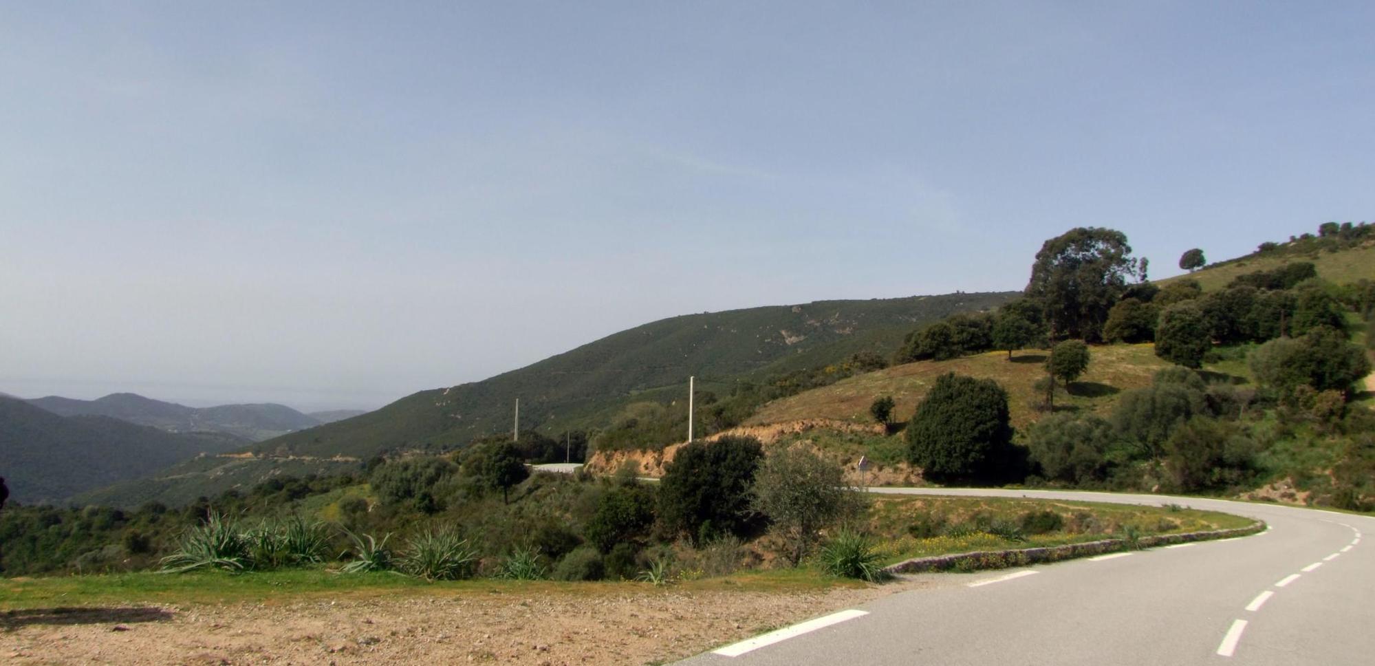 The road bottoms out in the village of Porto, little more than a hotel and holiday homes at the head of a bay between two mountains. Lots of overseas visitors sit outside a café, some wave as I begin climbing again. Then with my eyes on the road not far ahead of my front-wheel as the road becomes steeper, I follow the curb round a bend to the right thinking this is the way the road goes. If I had of been looking up, I would've seen that the main highway goes straight on. I think straightaway there's something not right here. The road on the map follows near the coast, while this road is going inland, into the valley beyond the head of the bay.