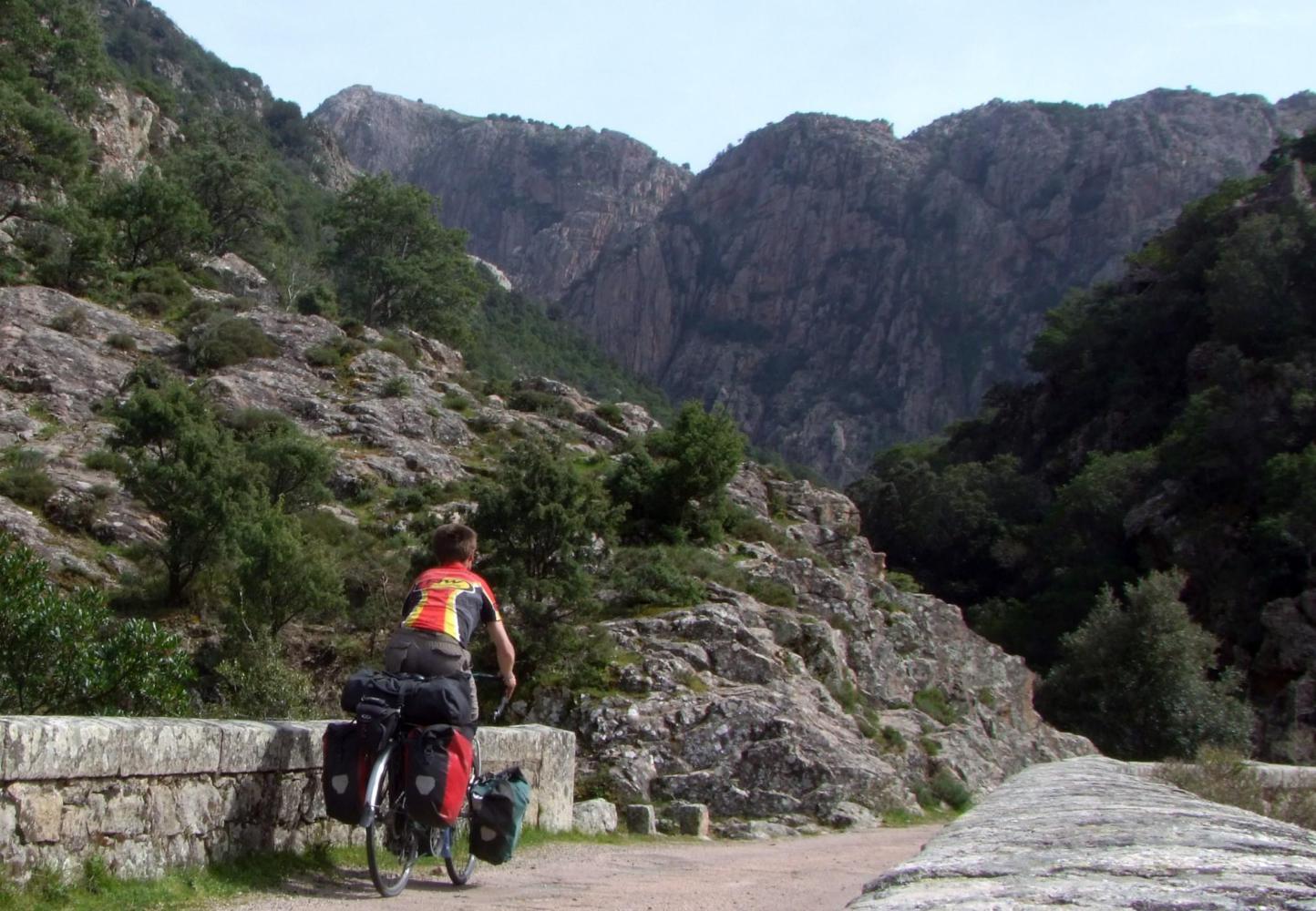 I drawn out the map and see that this road I'm on and now know isn't the main highway I intented taking, is a white road on the map. It crosses the valley ahead where it becomes two parallel lines and squiggles up to the road to Corto. I decide to continue pass the broken up road. A kilometre on I descend and cross a narrow stone bridge. The road onwards then is reduced to a rough stony track on which I'm soon off pushing.