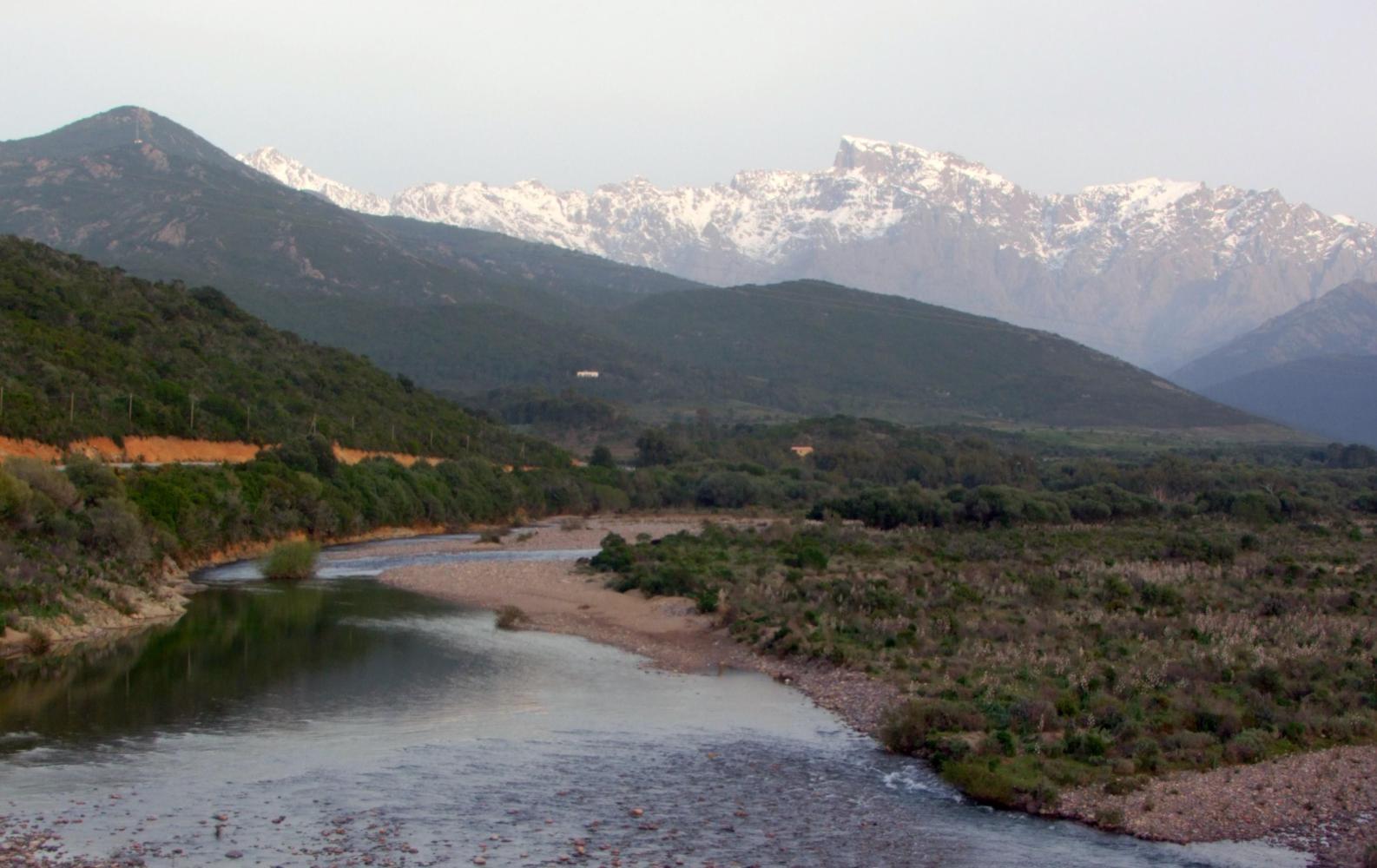I double back, back pass the collapsed road and through the village where the two old men are still in the same place chatting. Back on the right road again there's climbing for most of what remains of the afternoon until I sweep down into a gravel wash river valley and cross over a long narrow bridge. At the other side of the river is a turn off left. A smaller road following nearer the coast, which is my goal for the day, as I think it'll be easy to find a place to camp near the shore. But the road remains well up a slope from the shore with the ground either side steep and rocky affording no level clear place for a tent.