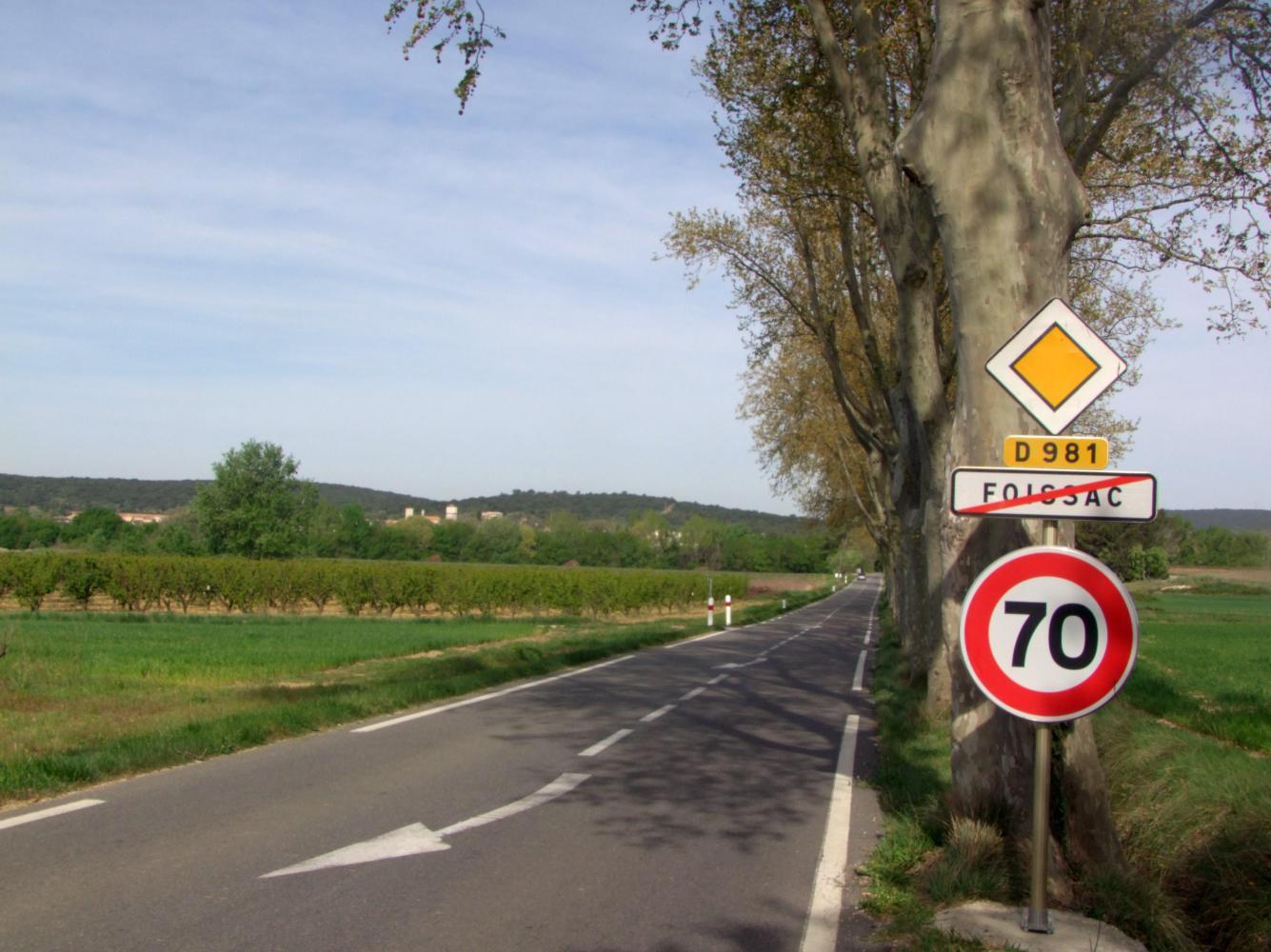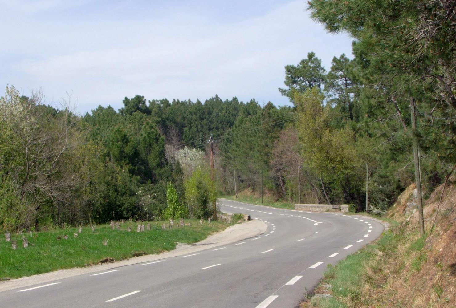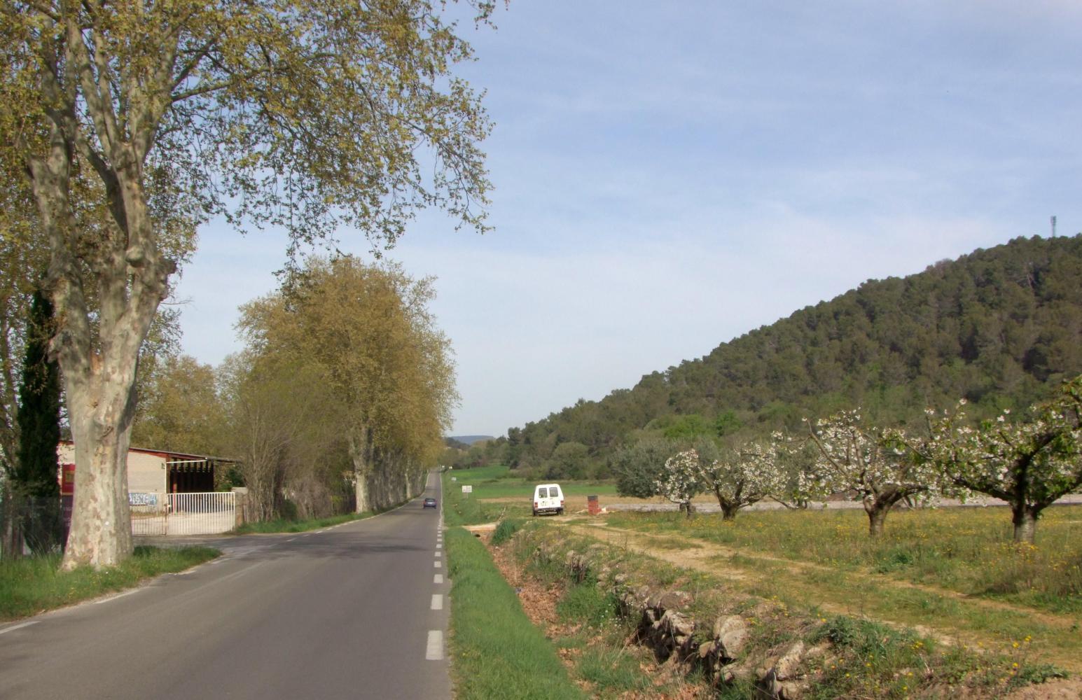 I'm on the road by eight thirty, following the sign from the roundabout for Ales. The road has a "Velo Vert" cycle-route marked at the side into Uzes where the cycle-route takes another way. The way onwards is a band of asphalt edged with broken white lines and often lined with shading canopies of tall trees. It passes through increasing undulating countryside with wooded hills and orchards and vineyards either side. Ahead there is the blue outline of distance mountains.