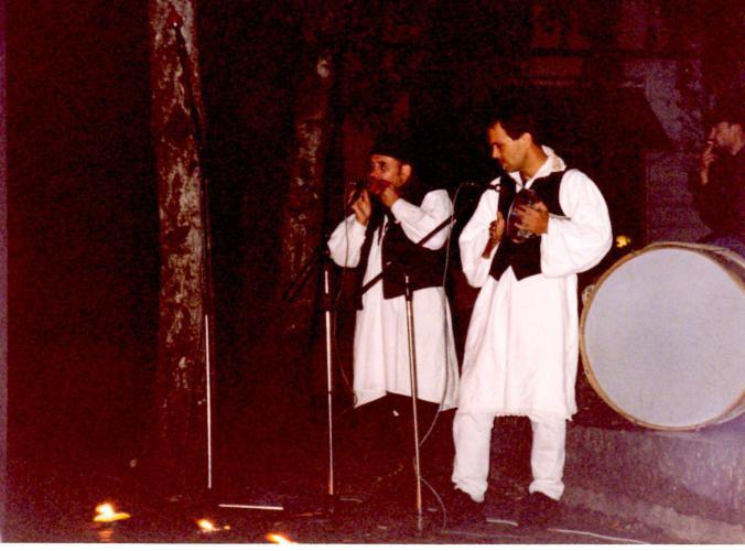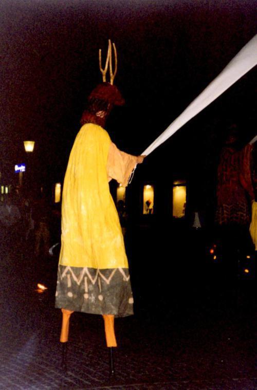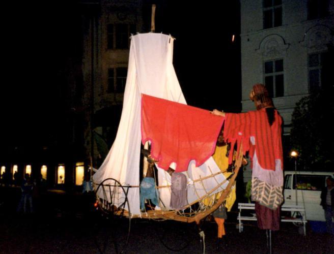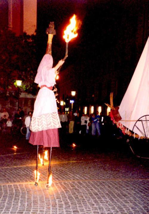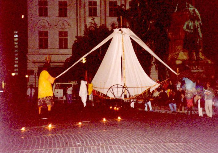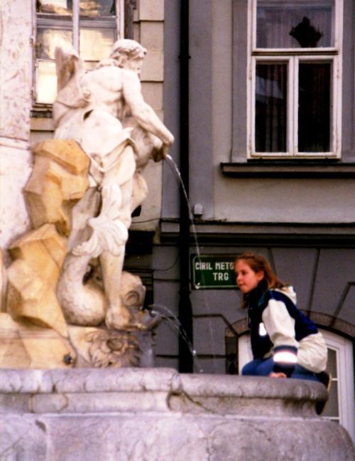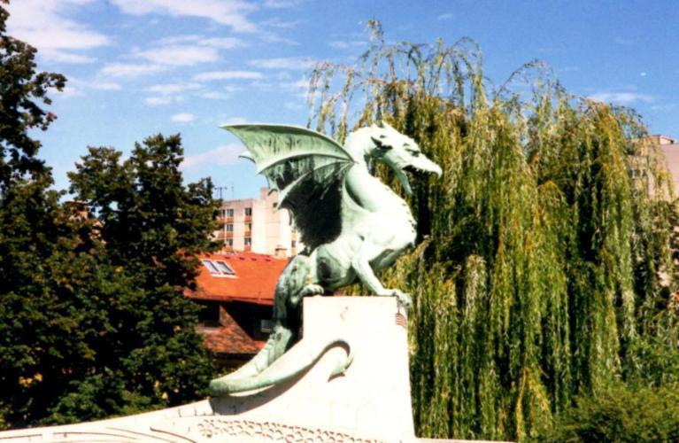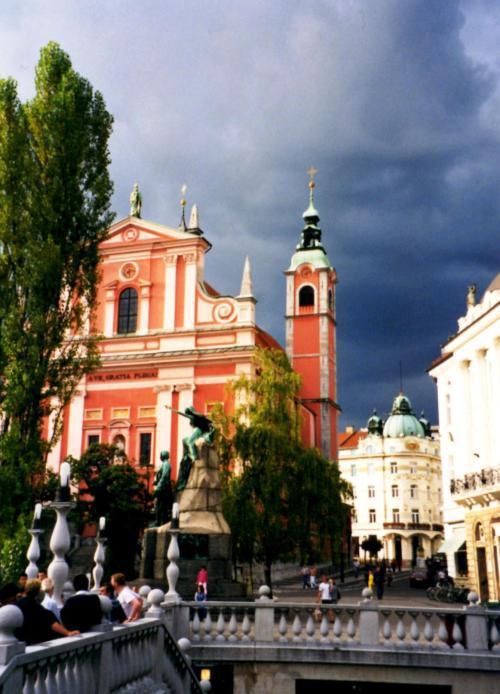 The highlight of our visit was as spectators to a fantastic street theater presentation which took place on Preseren Square, between the triple bridge connecting west bank to old town and the lovely facade of the Franciscan church. This specacle, which we later learned was part of the Lutke International Puppet Theater Festival, took place within a candlelit semicircle in front of the Preseren monument. It began with an instrumental overture played by a pair dressed in what to me looked like traditional Albanian garb. After about 15 minutes of dronish but increasingly agitated music, a sheet-shrouded sailing ship was drawn into the circle from across the bridge by three eerily costumed figures bobbing and weaving on stilts. For the next 15 minutes or so they enacted a dazzling myth of unknown origin, highlighted by a balletlike dance between two winged, hawk-headed monsters who then metmorphosed into what looked to be Byzantine kings. Two of them then enacted a battle with flaming staves which they lit from an assortment of torches. The battle included the torching of each others stilts, their demise, and their subsequent resurrection as hawks again. It was an eerie, dramatic and riveting performance.