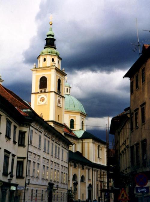 After a great buffet breakfast (muesli, hard boiled eggs, cheese, sliced meat, juice), we biked the short stretch to the capitol, lengthening it at several points by unintentional detours. We followed a very pretty but convoluted route that mostly avoided the main, busy thoroughfare until we submerged ourselves into the Ljubljana street system. Penetrating the city by bike was fairly painless - we encountered a marked bike route which steered us from almost the city limits to the core.