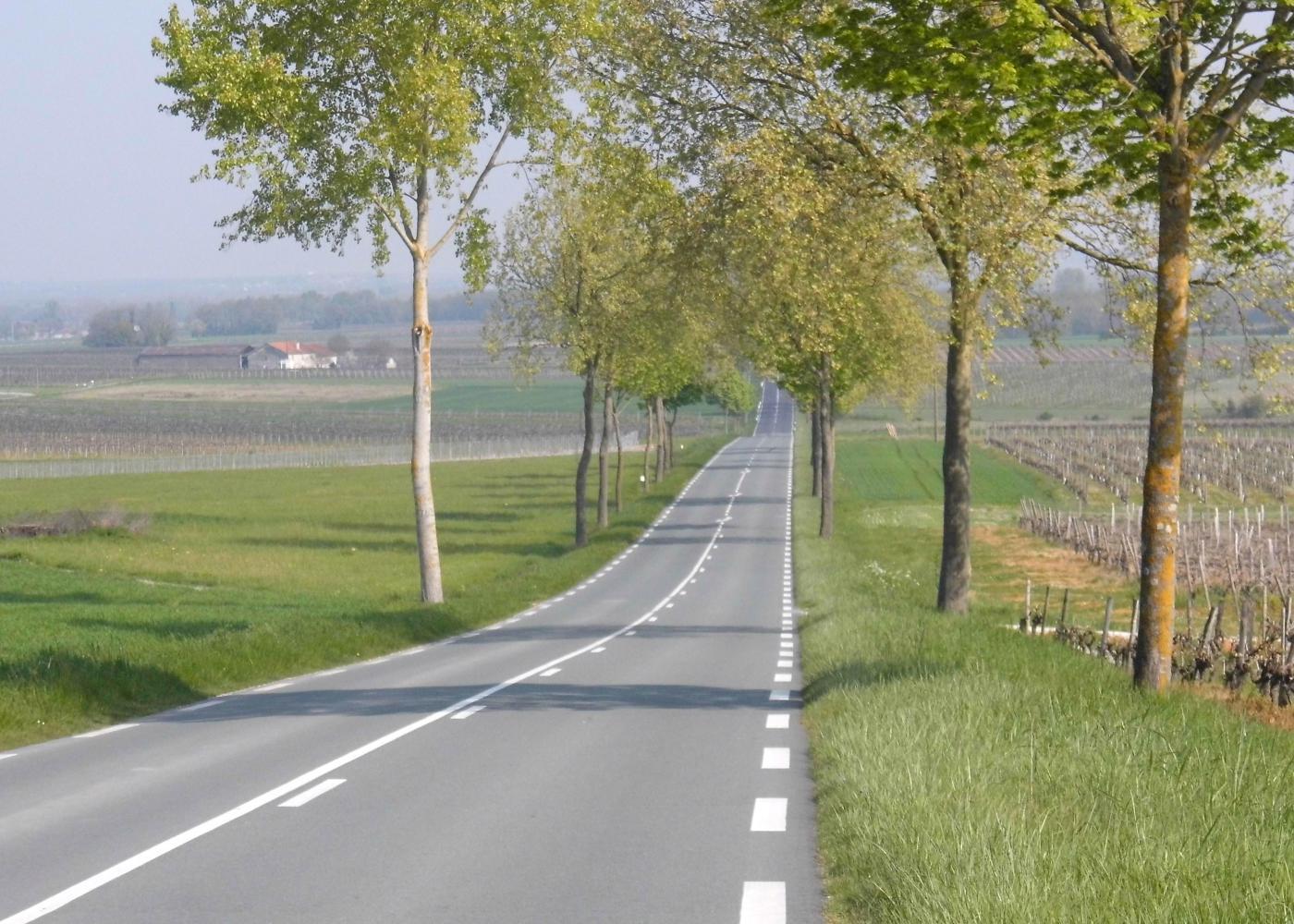I reach Cognac at twelve-thirty and lunch sat on a bench in what is the main square, though almost deserted except for two teenage boys on skateboards, rattling over the flagstones by the monument in the middle. But once I finish and ride on, I come to a smaller square with a green and cafes with tables of diners along two sides; at one, I take a seat and when the waiter comes over, order a Café Crème, then unfold the map. There's one clear direct route north. A yellow D road to Saint Hilaire de Villefrance, then a long straight red road, D150.