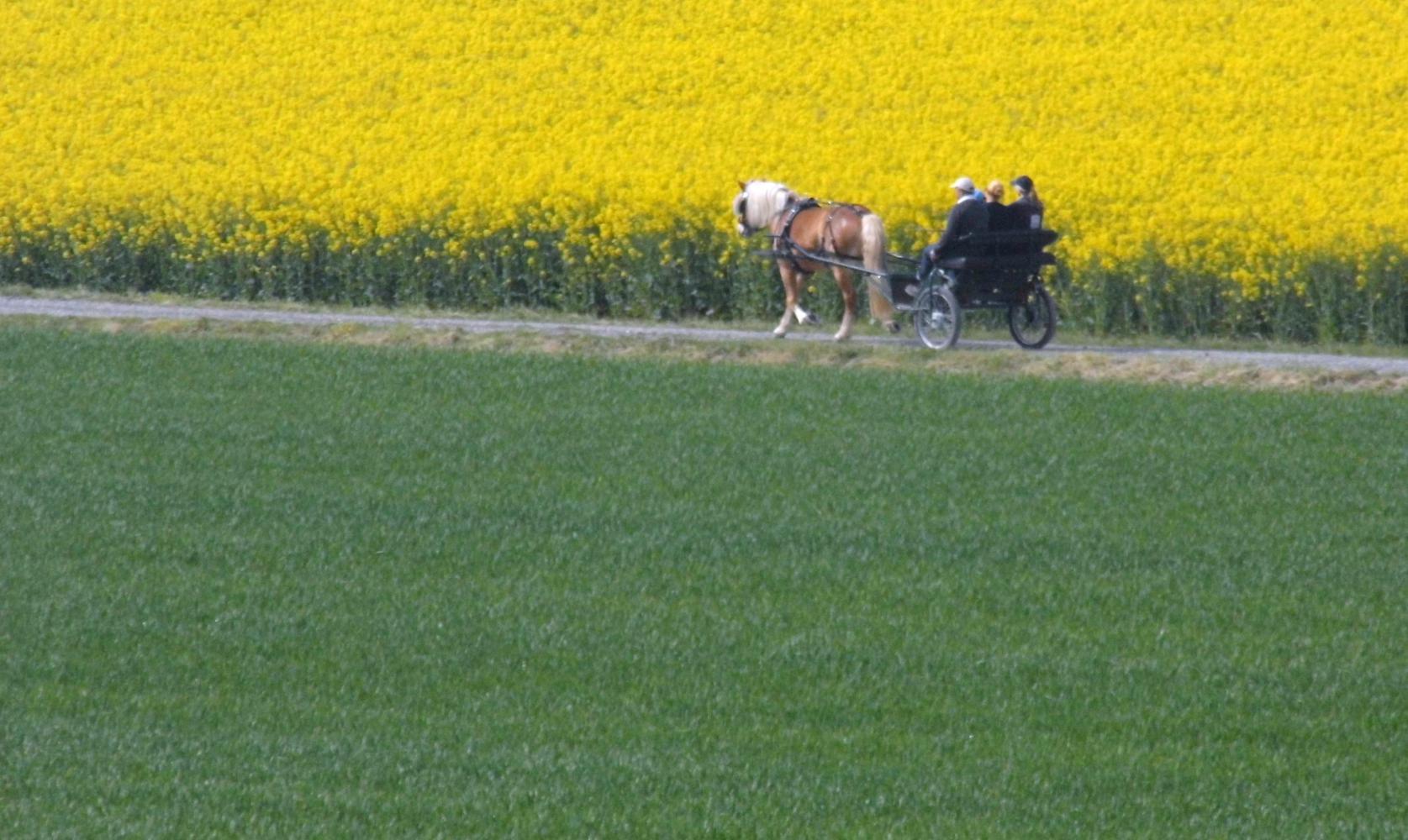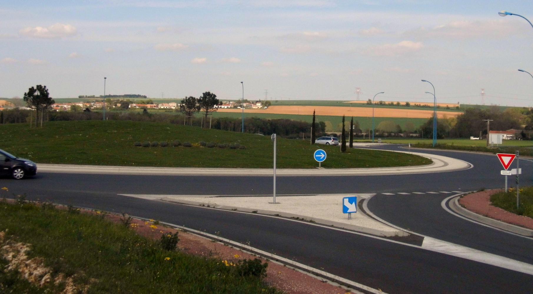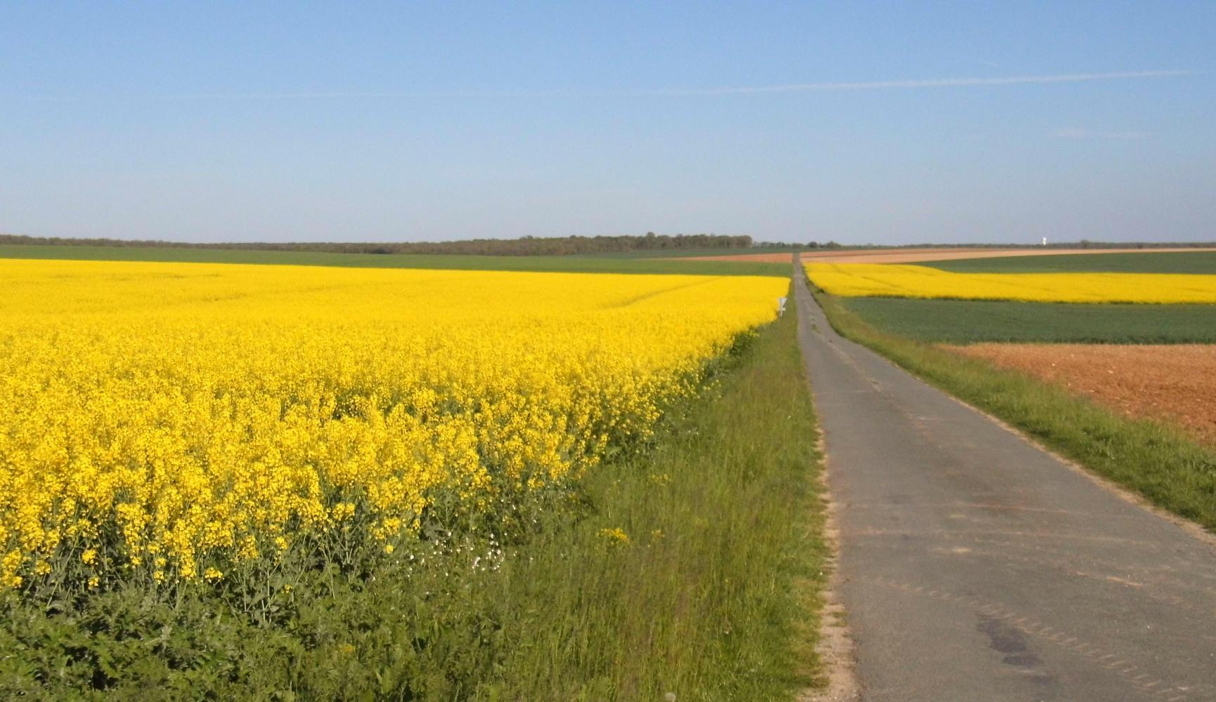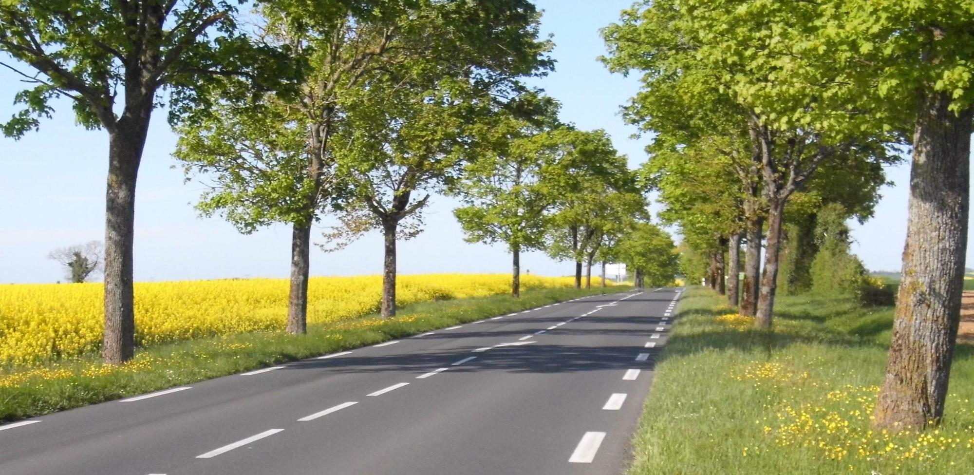 Although red, D150 isn't too bad to cycle on. Whether it is Sunday or what, the traffic is only a trickle along straight tree lined avenue, rolling up and down over regular undulations, pass fields of verdant green wheat and bright yellow rapeseed.