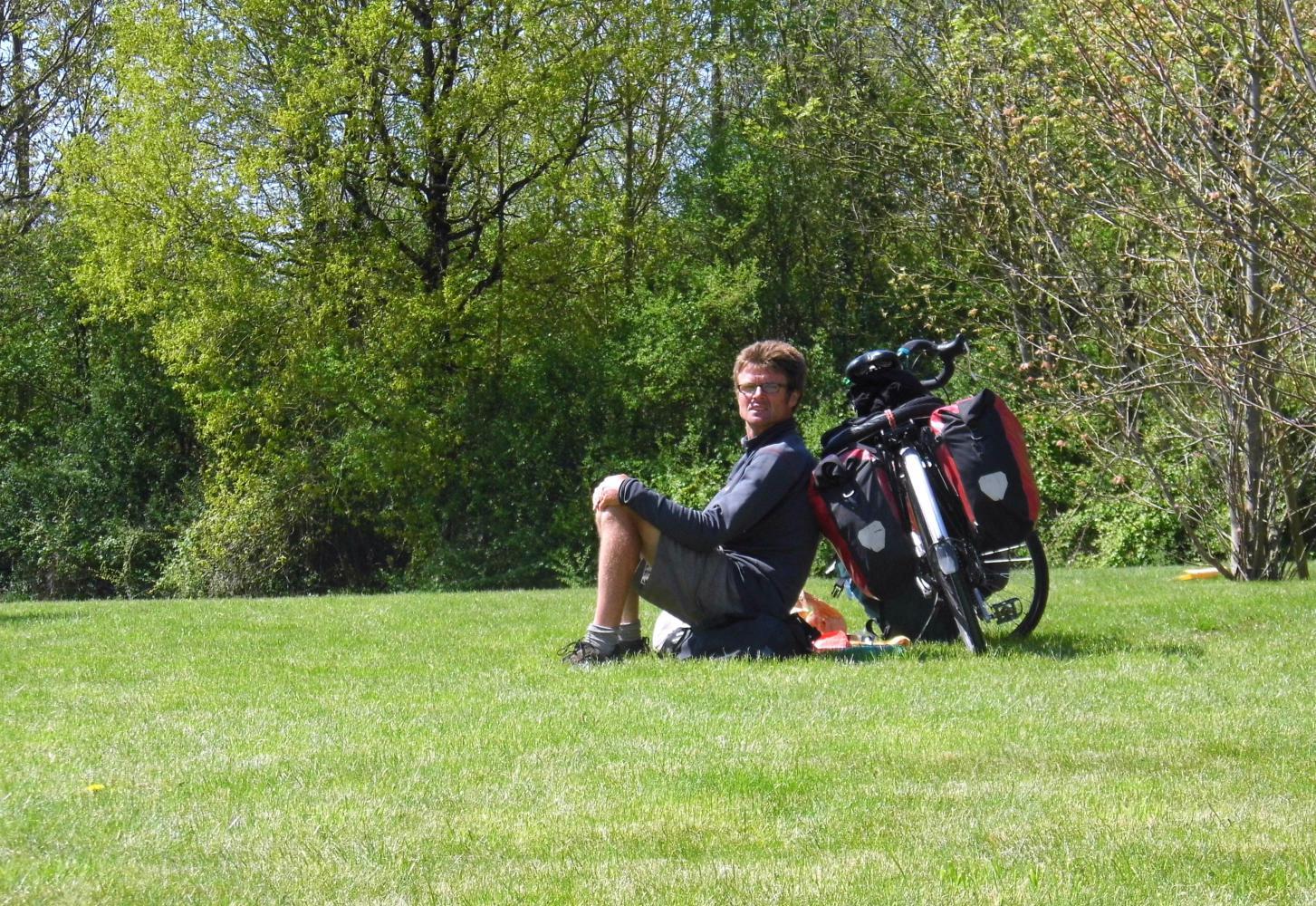 The minor road, just a country lane, meanders, bridges the motorway and runs around a field of black and white dairy cows, then bridges the motorway again. It is time to look out for somewhere to camp, but its nearly all fenced in pastureland. Keep out. Then I come to a huge feed mill, opposite which is woodland with a gateway in. I push the bike off the road and in beyond the gateway out of sight. A short way in the trees give way to a pond with near the water's edge, level grassy areas in among stout tree-trunks. An ideal place to camp.