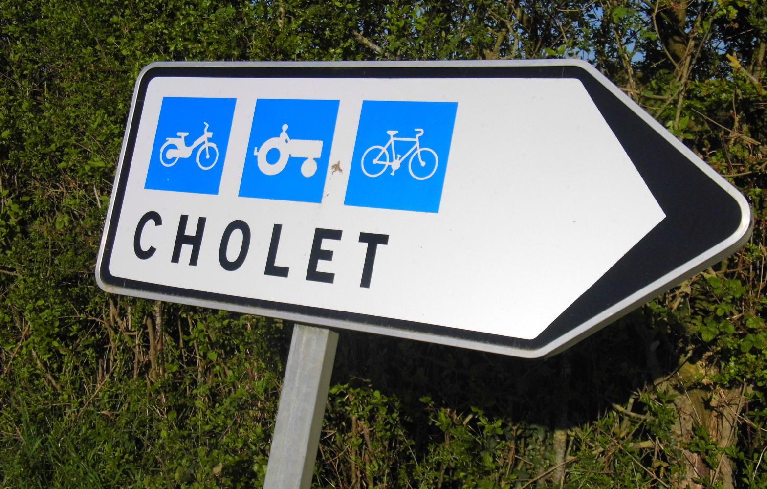The quiet country road nature of the itinary continues until reaching the large town of Cholet; where, I follow the signs from a long series of roundabouts for the next place. Then come to a roundabout, where the road I'm on, although a D road, is a motorway onwards: there's a blue no cycling sign; but, there is a sign directing cyclists and slow vehicles along a minor road.